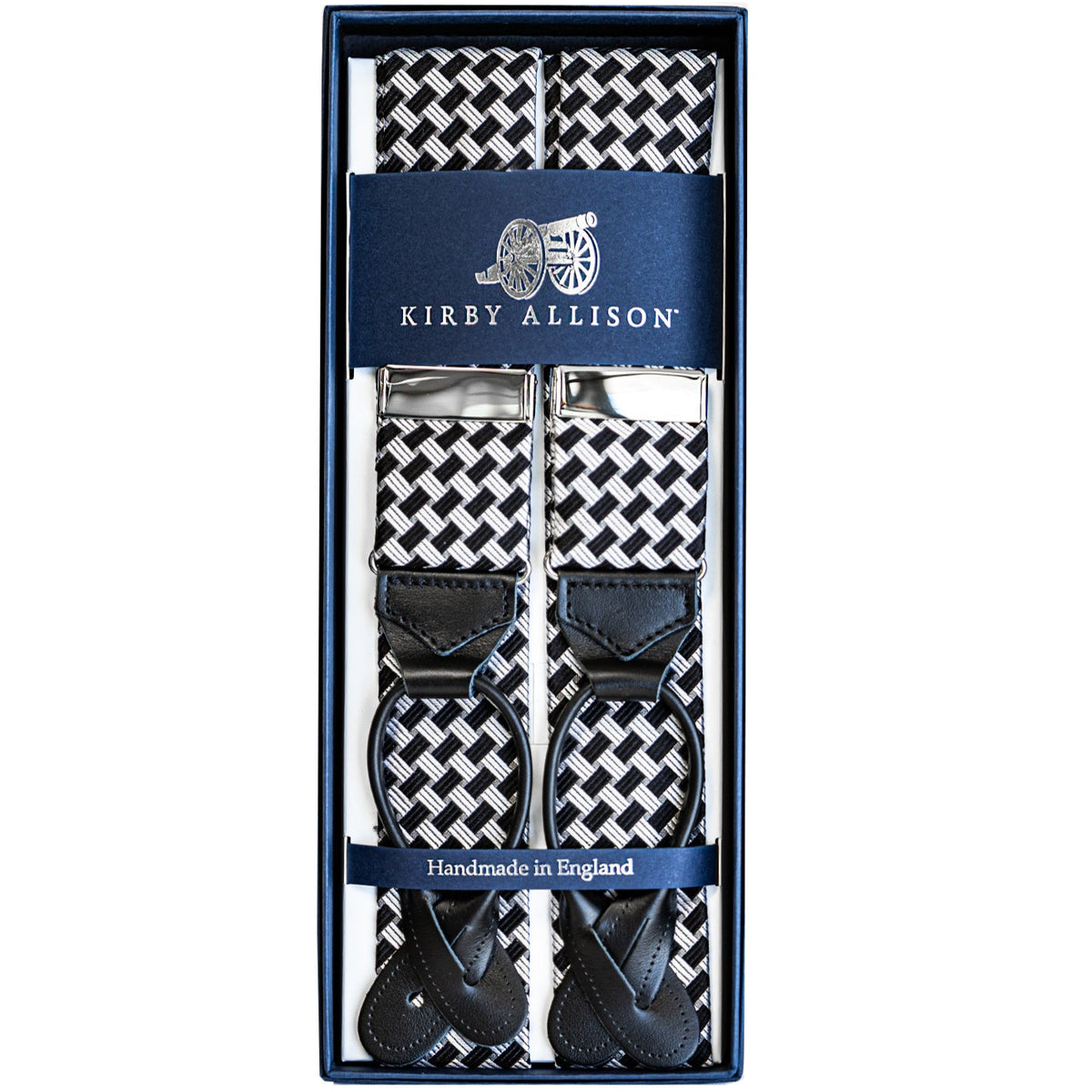 A pair of Sovereign Grade Plain Midnight Braces with leather ends by KirbyAllison.com in a box.