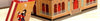 A close-up of a decorative object resembling a blue building facade with arched windows and doors. A smaller item with a palm tree design is positioned in front.