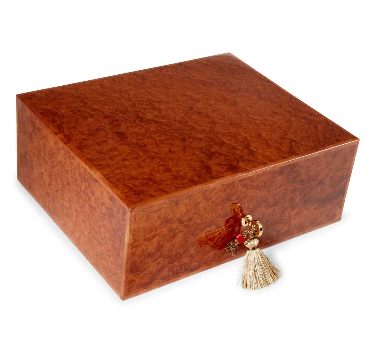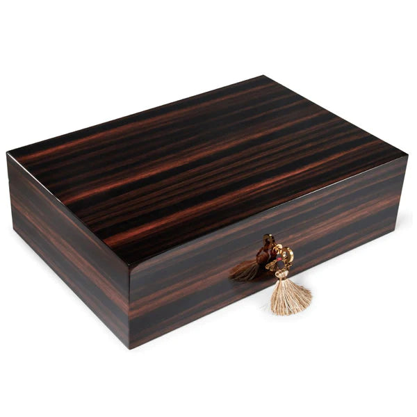 An Elie Bleu Black Sycamore "Medals" Humidor - 120 Cigars with a tassel on it.