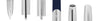 Close-up of various silver pen parts, including nibs, barrels, and caps, arranged in a row against a white background.