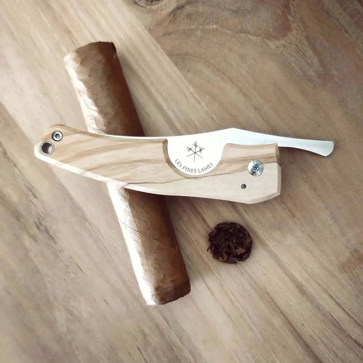 A Kirby Allison Olive Wood Cigar Knife from KirbyAllison.com featuring a durable Mediterranean wood handle on a white background.