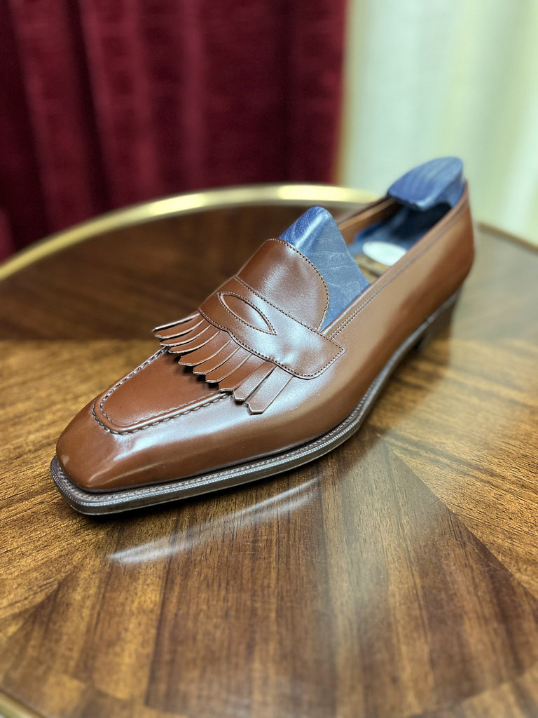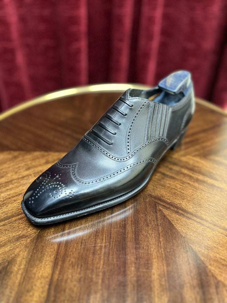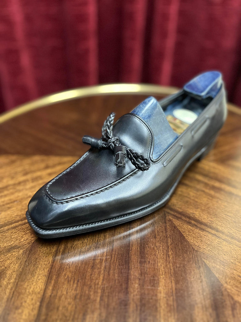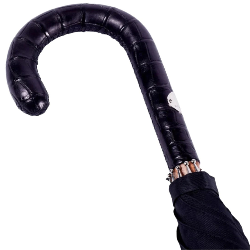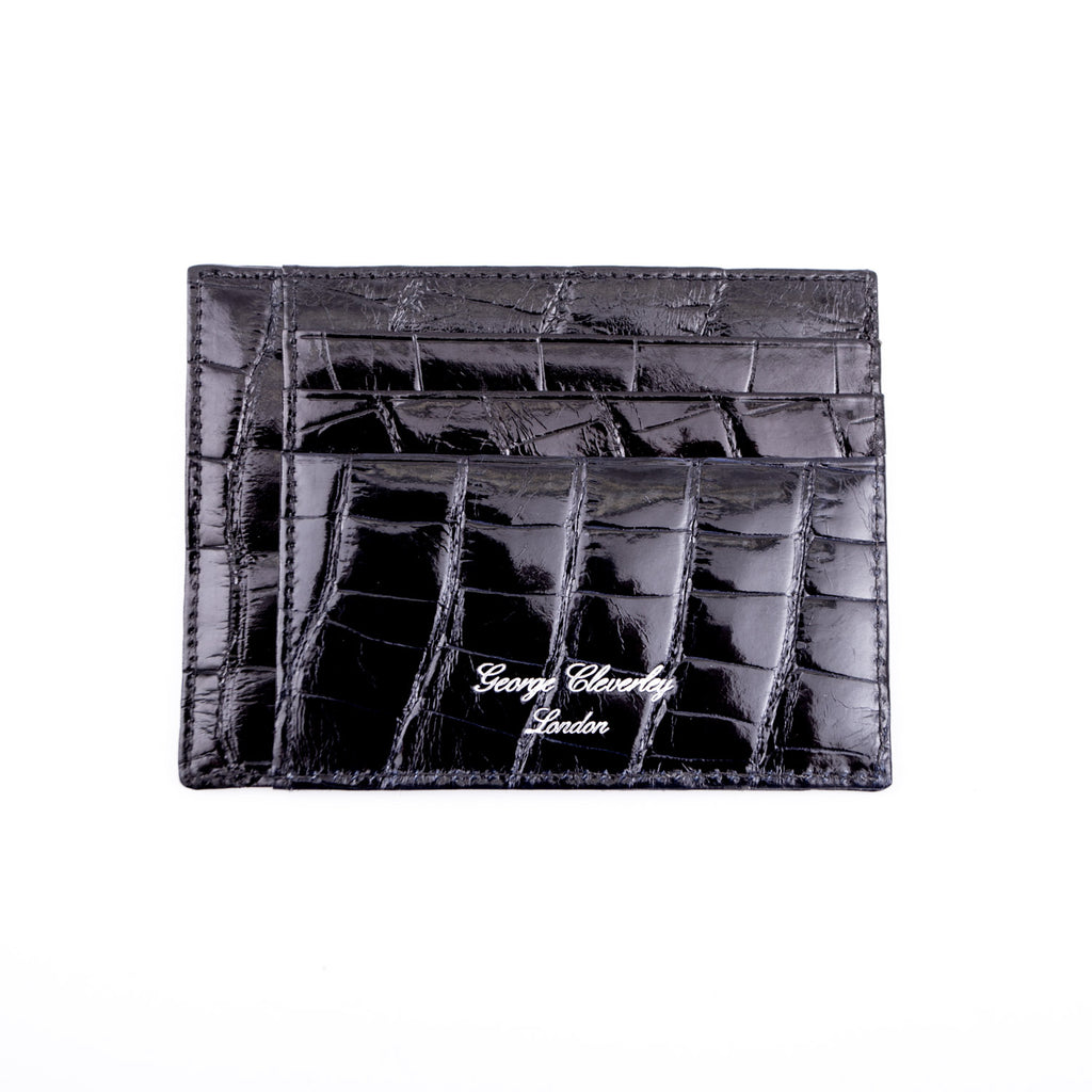 A pair of KirbyAllison.com High Shine Service black and brown crocodile boots on a white background.