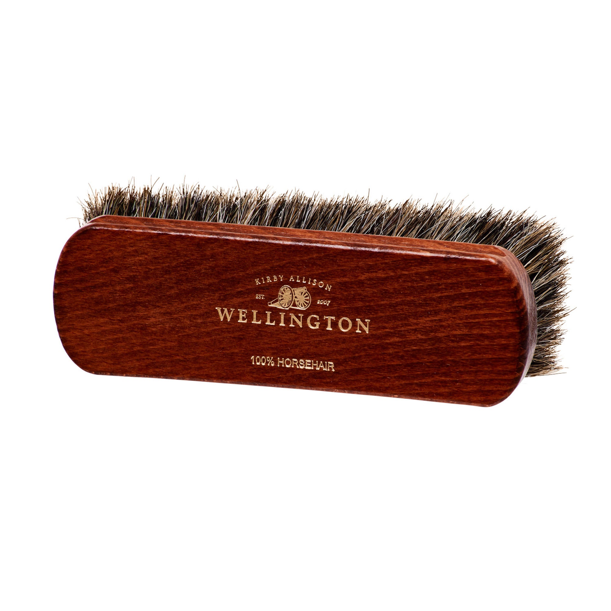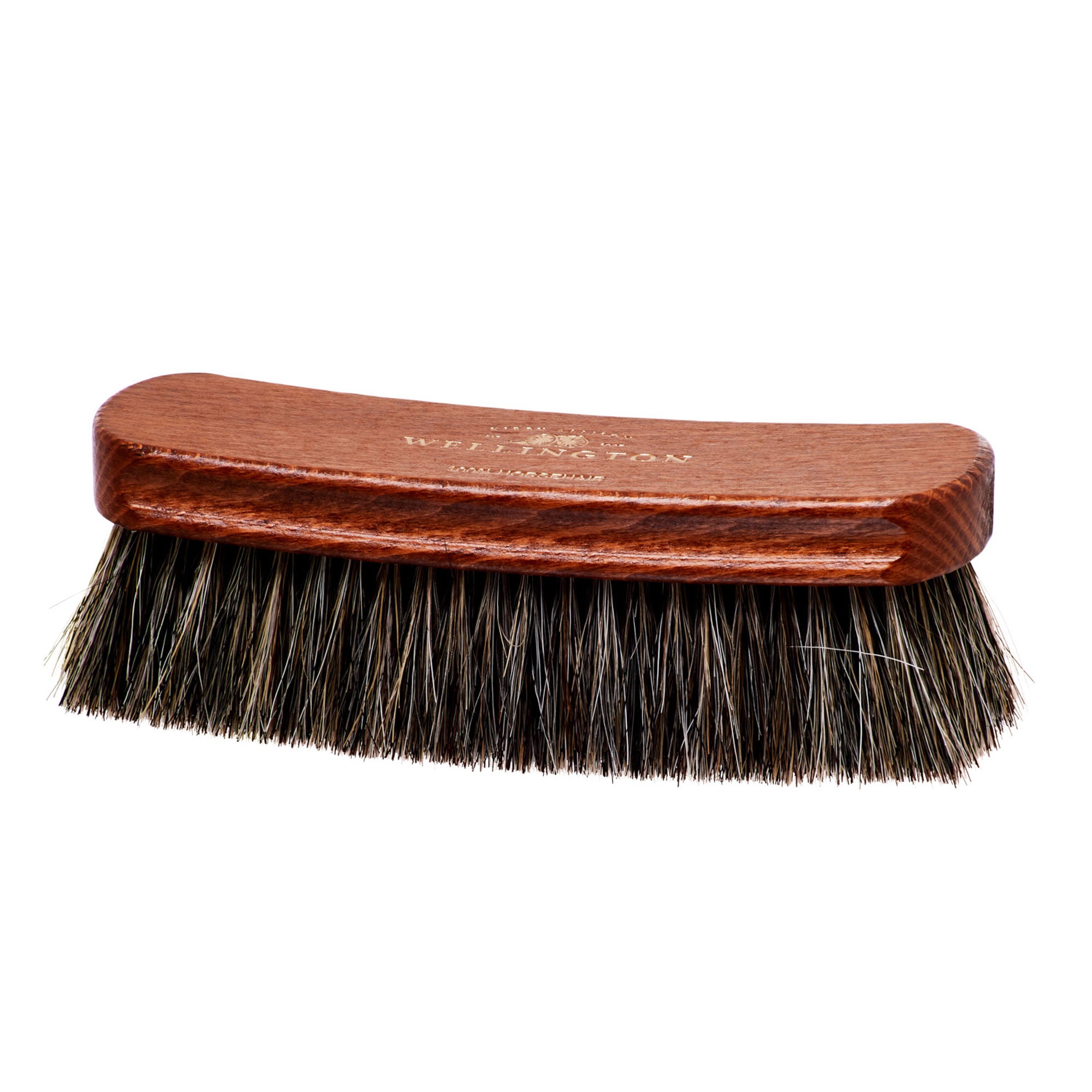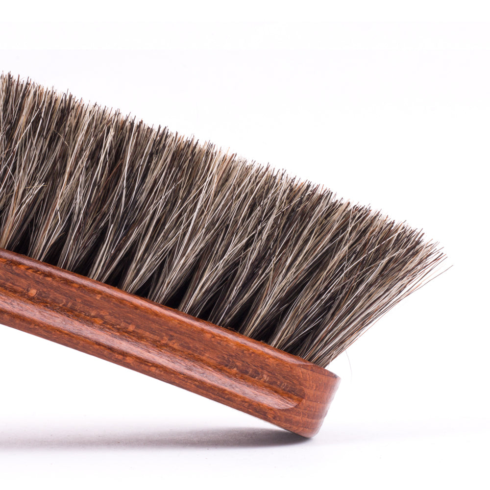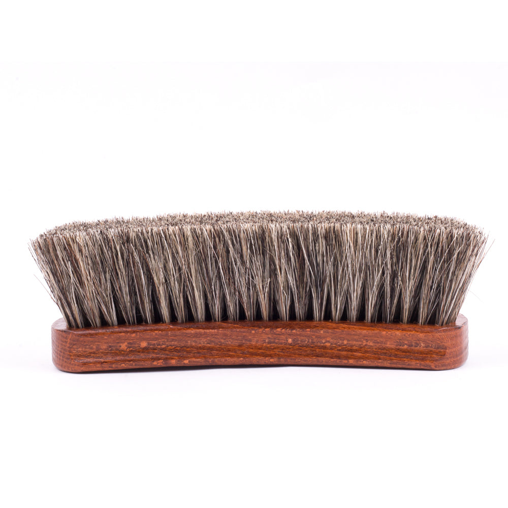 Our Wellington Deluxe Horsehair Buffing Brush is an essential tool for taking care of your shoes. This features extremely long, thick 100% no-bleed horse tail bristles. The difference between the Medium Wellington Horsehair Polishing Brush and this one is subtle - the longer bristles allow for the brush to smoothly glide over the shoe, making this complimentary brush ideal for the final buff after a shoe shine as well as for cleaning your shoes at the start or end of the day.