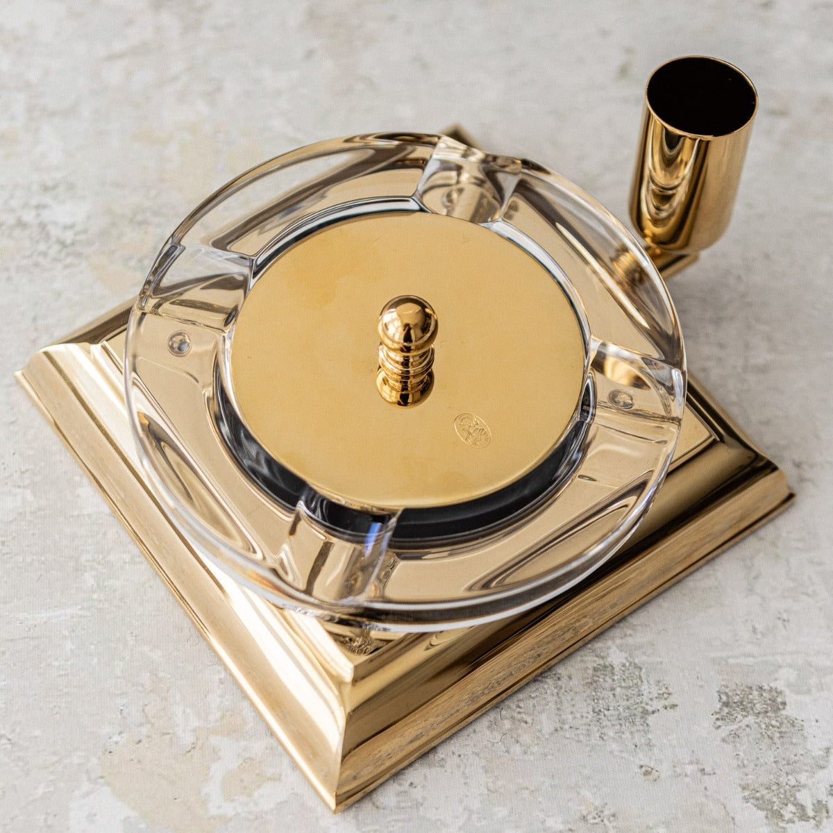 This elegant ashtray is handmade in Spain by El Casco, a world-renowned metalwork company specializing in old-world desk accessories. The ashtray is made of crystal with a solid brass base plated in 23 kt gold and hand-polished to a brilliant finish.
