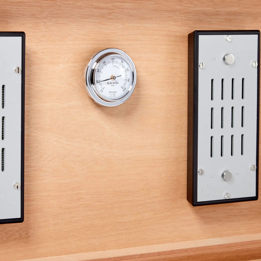 Inside, the humidor is lined in Spanish cedar and features an integrated hygrometer and humidification system to ensure your cigars are kept in ideal condition. With room for up to 110 cigars, it is both a functional storage piece and a captivating work of art.