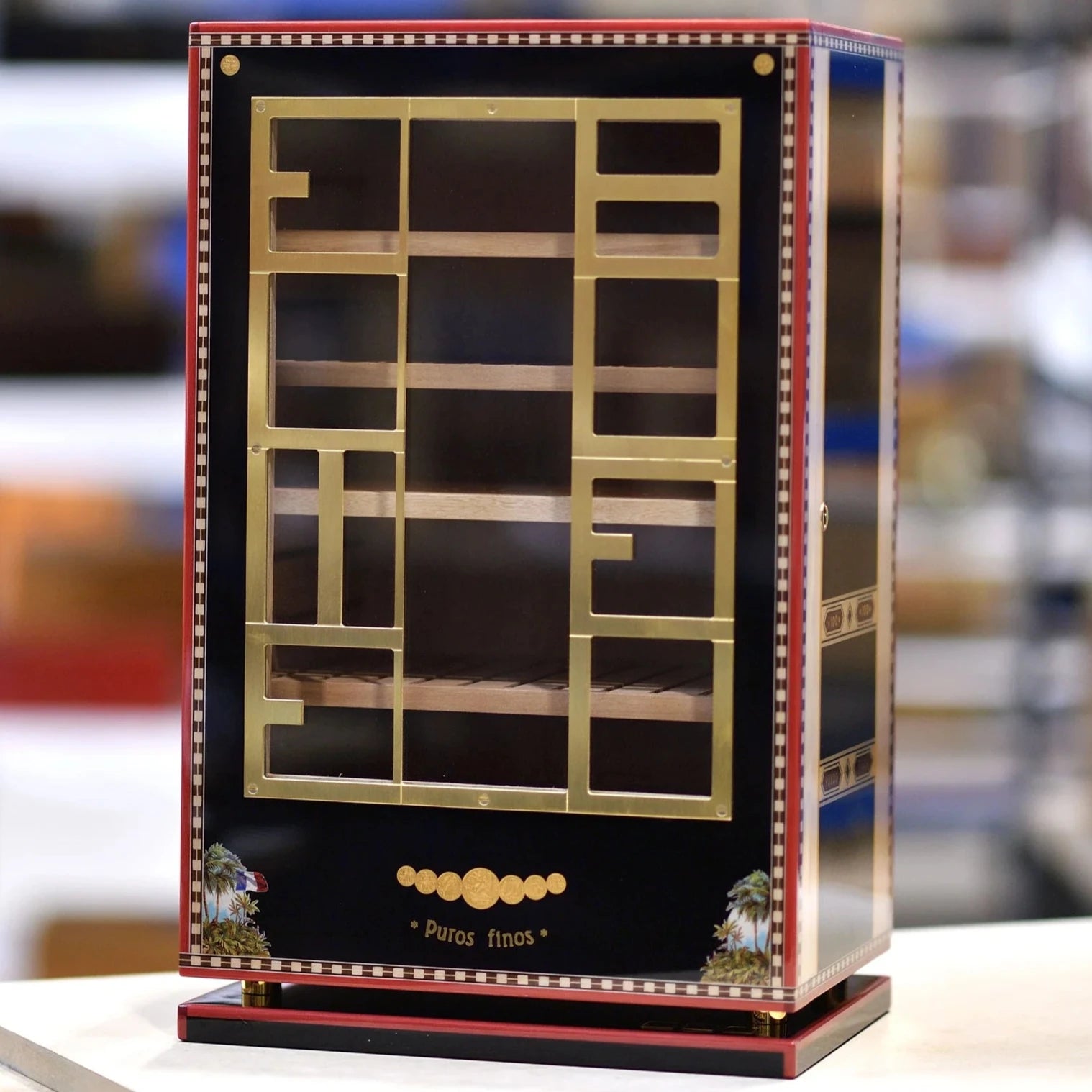 This Cuban Vintage Humidor Cabinet from Elie Bleu, crafted from exotic dyed Sycamore wood. Inspired by traditional Cuban cigar box designs, this humidor features intricate exterior decorations that make it a true masterpiece of craftsmanship. Handcrafted by skilled artisans in France, the Flor de Alba series offers unmatched luxury, quality, and beauty, making each humidor a future heirloom that can be passed down through generations.