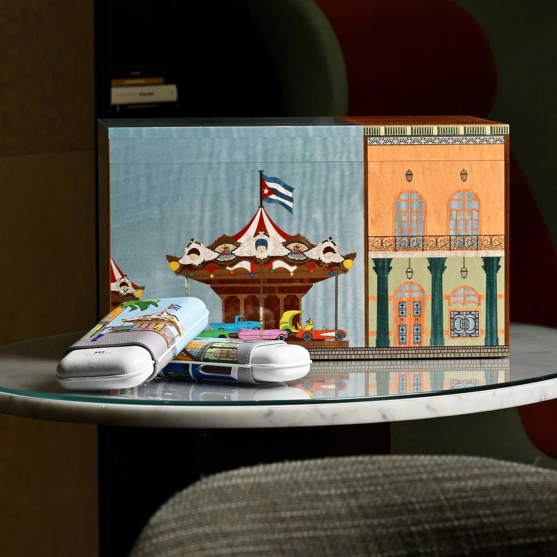 The Elie Bleu Carousel Cigar Box from the iconic Casa Cubana collection is a true masterpiece that invites you on a journey to the heart of Havana. Designed as a miniature replica of the city's renowned architecture, this best-selling box seamlessly blends luxury and functionality. Crafted from 12 types of wood with intricate marquetry, the box features metal transfers and three storage levels to hold up to 125 cigars. It includes two humidifiers and a needle hygrometer to ensure your cigars are perfectly preserved.