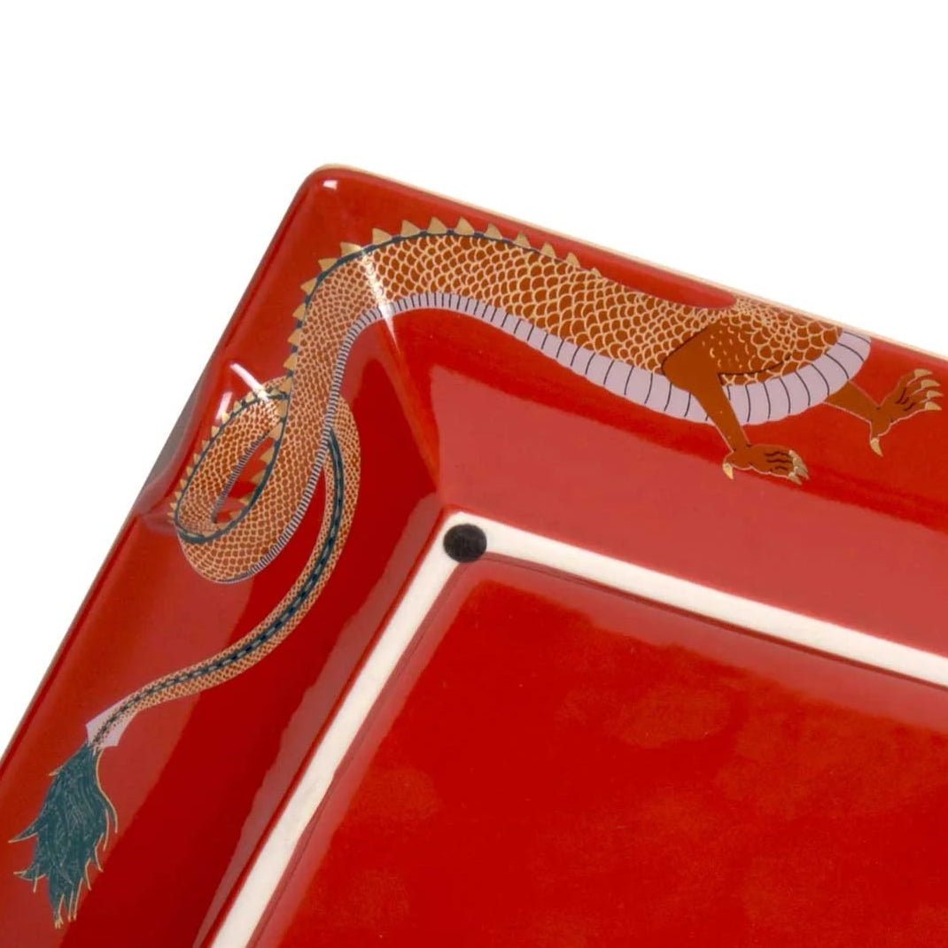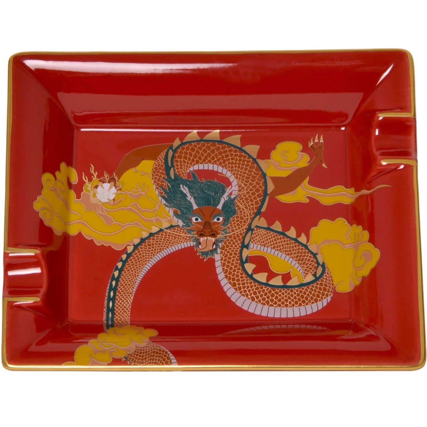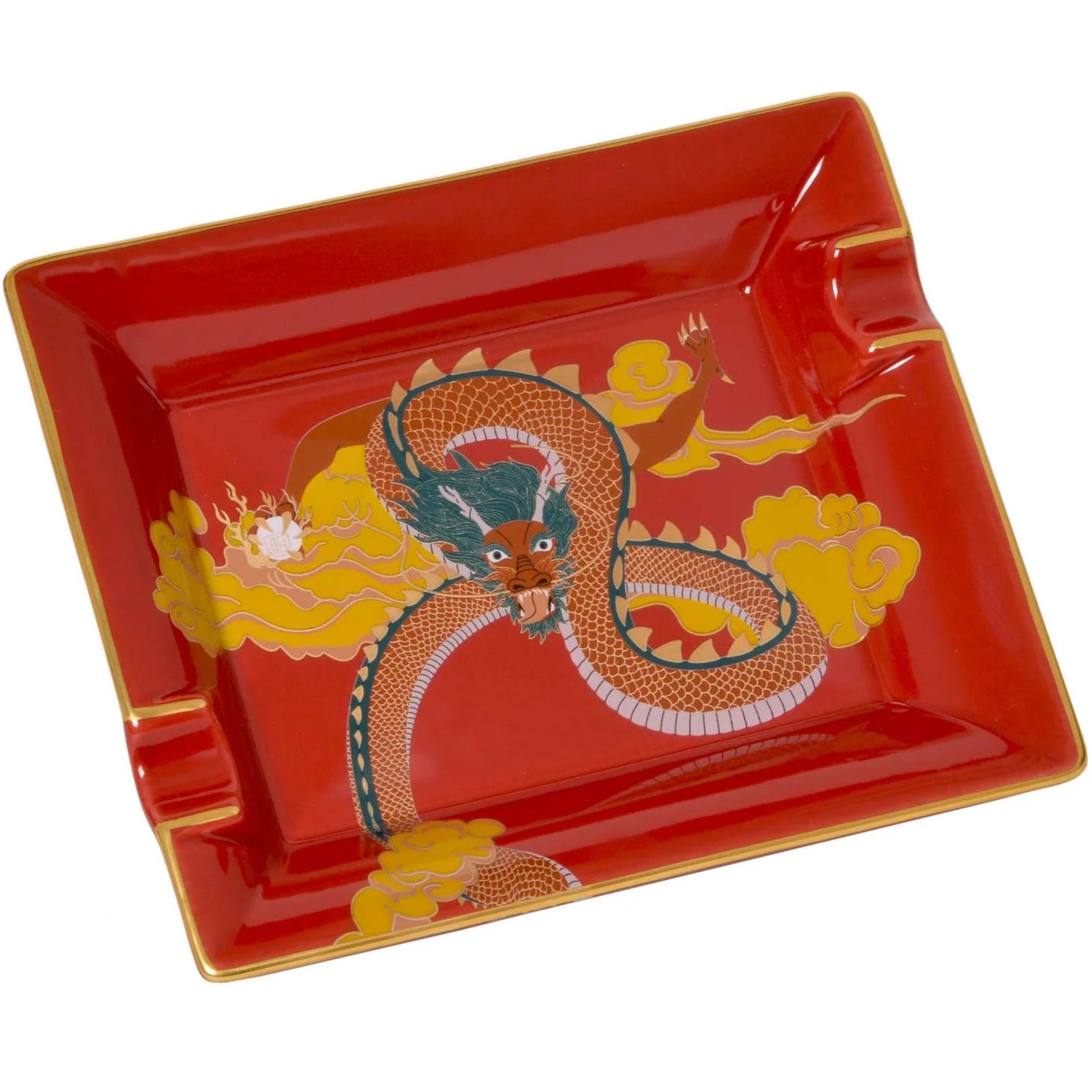 The vivid dragon motif, set against a rich red background and surrounded by golden clouds, is applied using the meticulous chromolithography technique. The result is an exceptionally vibrant and detailed finish, framed by gilded edges and four sculpted cigar rests. The base is lined with soft Alcantara, offering grip and protection for fine furniture surfaces.