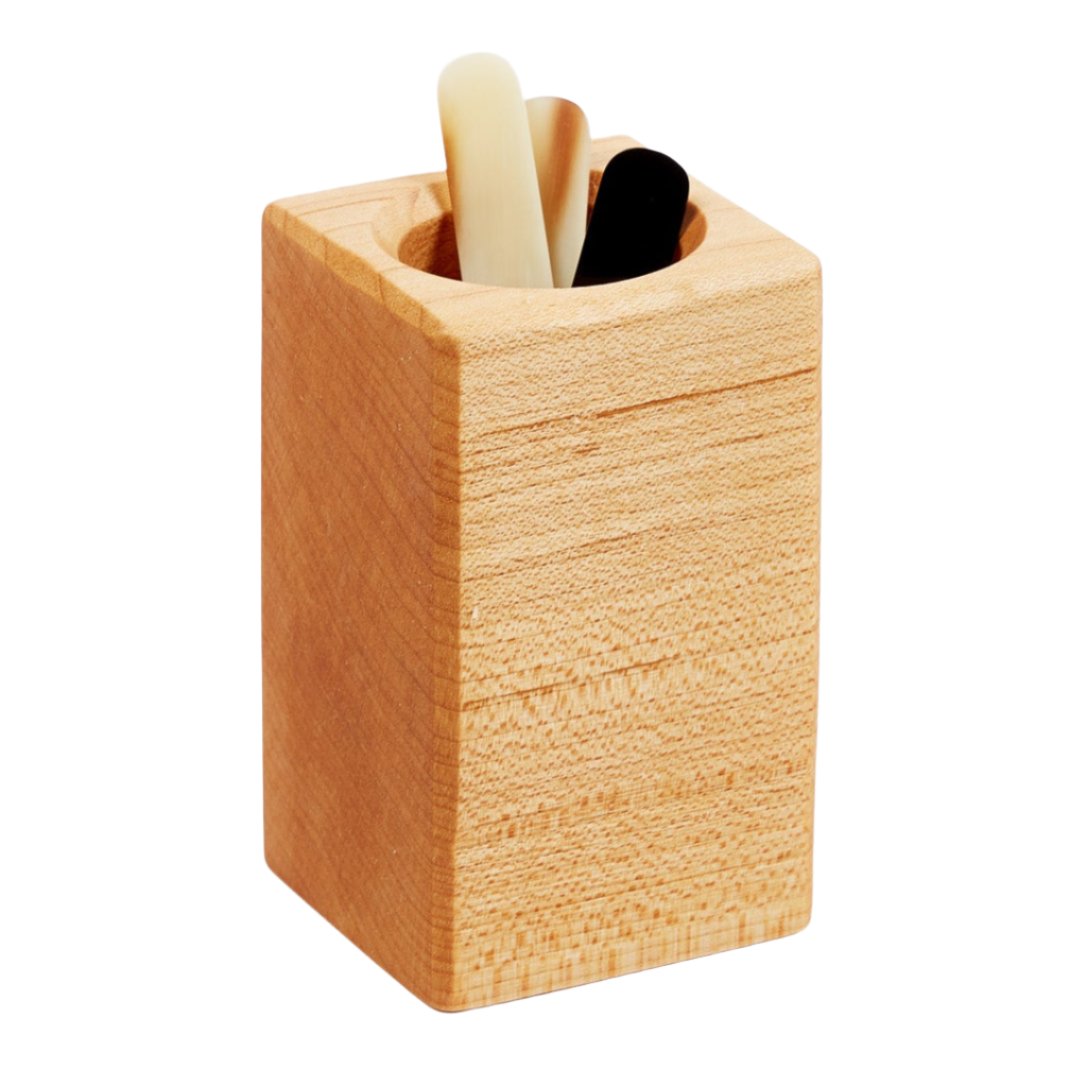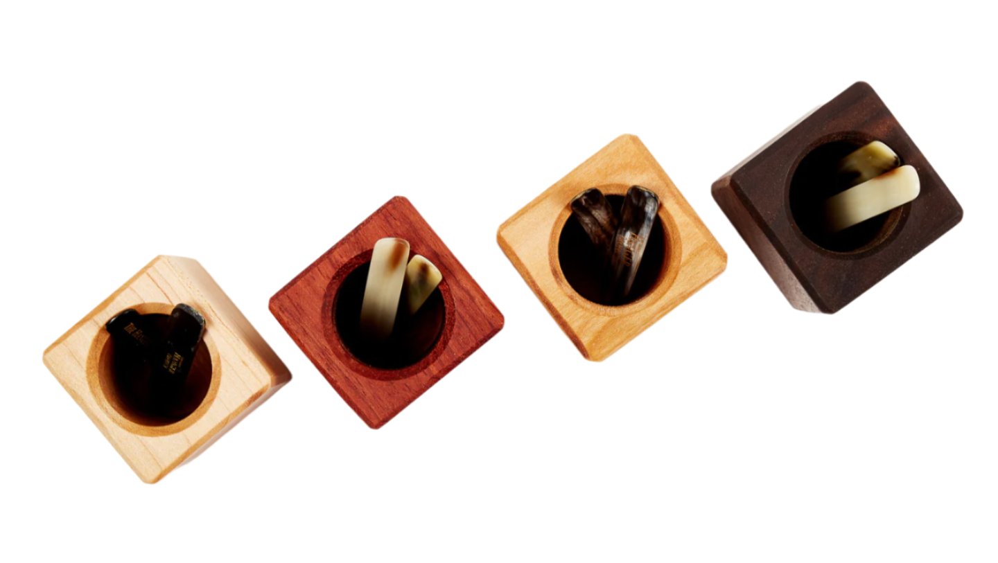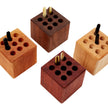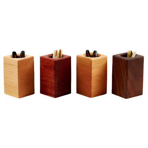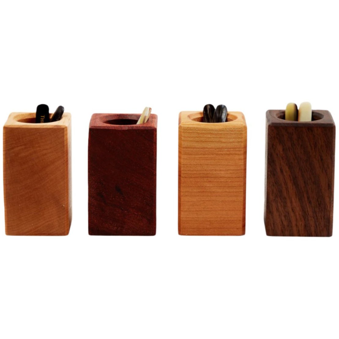 Four Hanger Project Large Collar Stay Holders designed to hold collar stays, made from premium woods by KirbyAllison.com. A collection of KirbyAllison.com Hanger Project Small Collar Stay Holder wooden boxes.