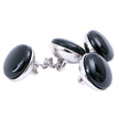Onyx Stone Gold Capsule Cufflinks in rose gold by KirbyAllison.com. Three Mother of Pearl Silver Stone Capsule Cufflinks on a silver plate by KirbyAllison.com. A pair of Mother of Pearl Gold Stone Capsule cufflinks with Indonesian mother of pearl from KirbyAllison.com. Handmade Jade Stone Chain Cufflinks ethically sourced from England by KirbyAllison.com. Handmade in England, Onyx Stone Rhodium Plated Capsule Cufflinks by KirbyAllison.com on a white background.