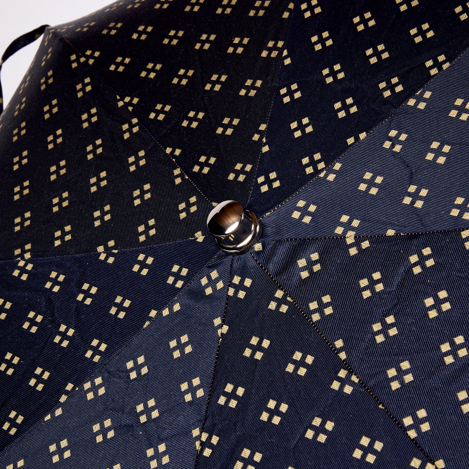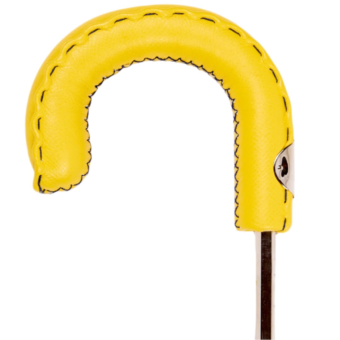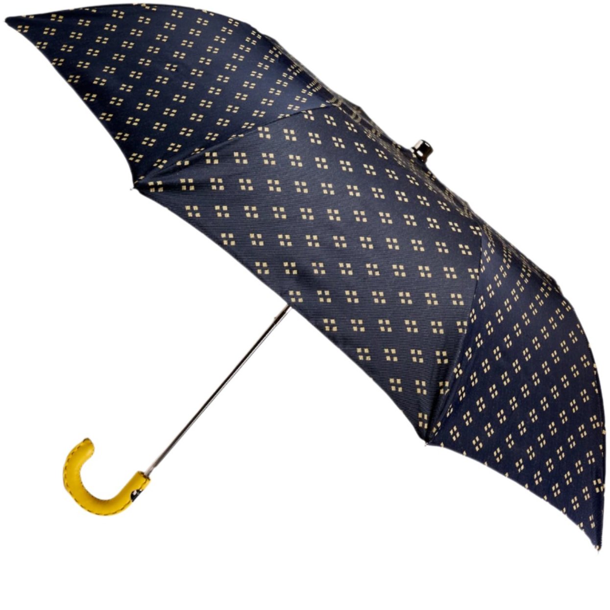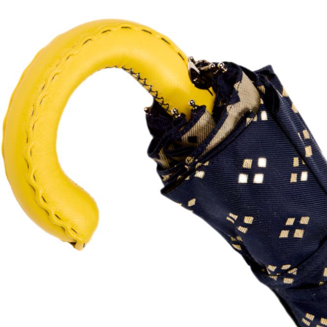 Handcrafted in Milan by some of Italy's finest artisans, this exquisite Kirby Allison Travel Umbrella showcases a sophisticated navy canopy adorned with yellow geometric crosshatch patterns, offering both style and durability. The vibrant yellow Moccasino leather handle not only provides a comfortable grip but also adds a touch of luxury to the design. Constructed from 100% polyester, the canopy ensures effective water resistance and longevity. Compact and lightweight, this umbrella is perfectly sized for travel, easily fitting into a briefcase or luggage, ideal for the city commuter or the global traveler.