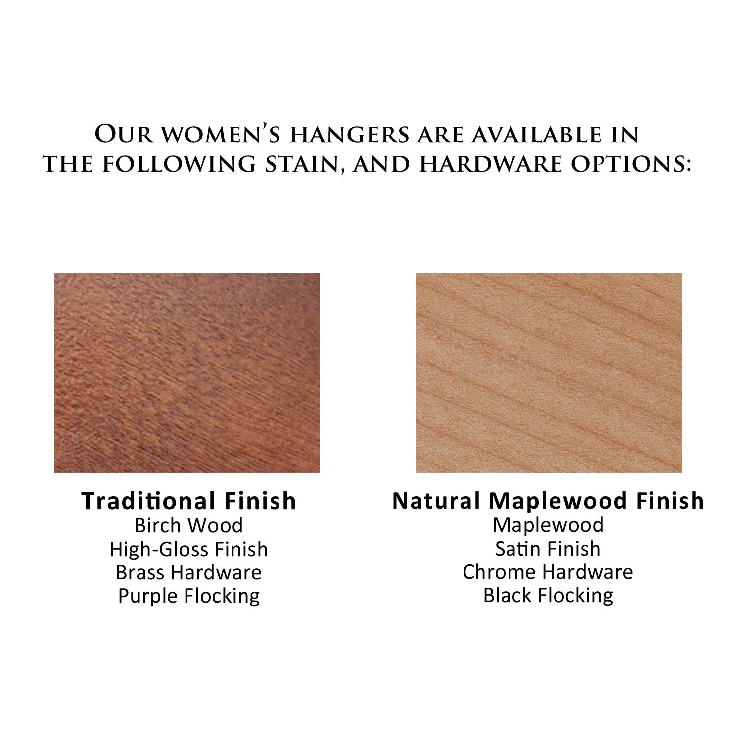 Our Luxury Women's Hangers have been crafted with utmost care to not only enhance the presentation of your clothing but also to optimize the utilization of space within your closet. The thoughtful designs and careful construction ensure that your garments are delicately cared for, minimizing the chances of wrinkles, creases, or damage that could occur with ordinary hangers. Just like our Luxury Men's Hanger collection, our Women's Hangers come in all three of our beautiful wood finishes and are available in three different profiles to accommodate your exact wardrobe needs.