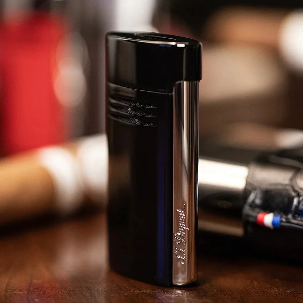 The Megajet is S.T. Dupont’s new classic lighter. Cigar smokers seeking performance, efficiency, and speed will admire its minimalist design, large size, and generous flat flame. Megajet black is the perfect combination of ergonomics and technology. Powerful blue flame. Large flat 20 mm flame. 3 air inlets with active charcoal. Ergonomic size.