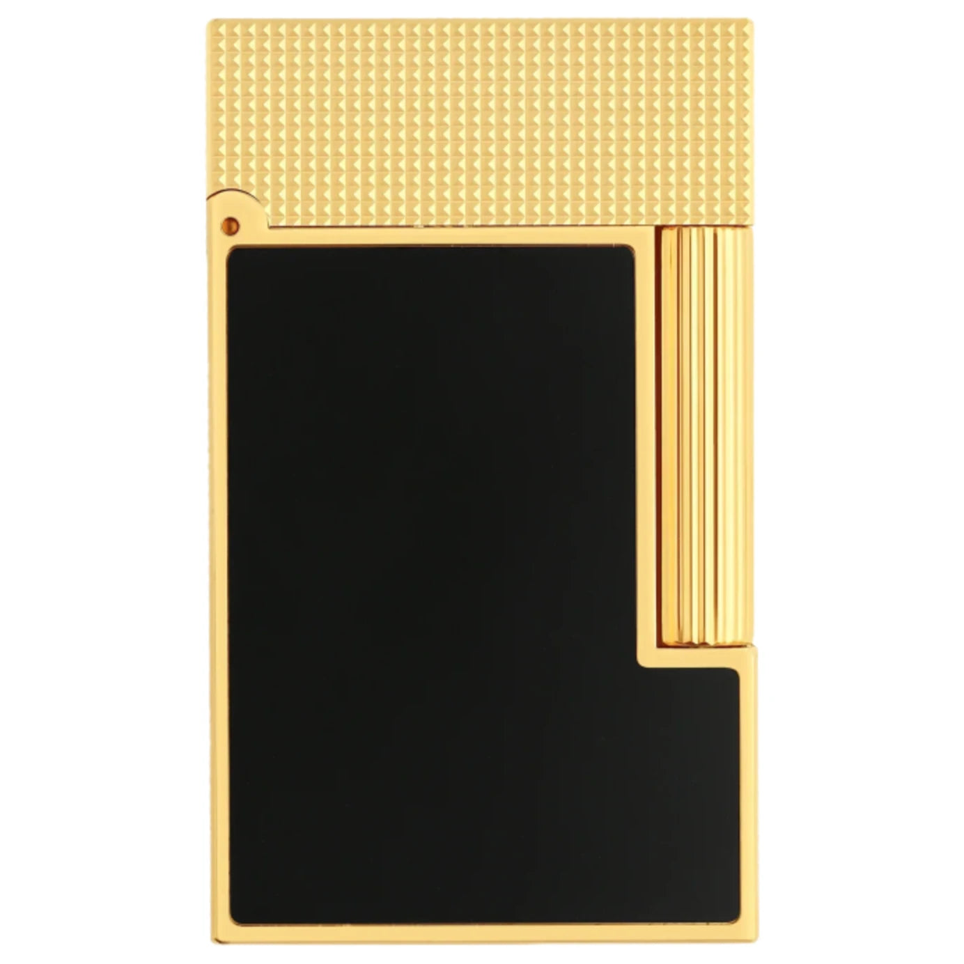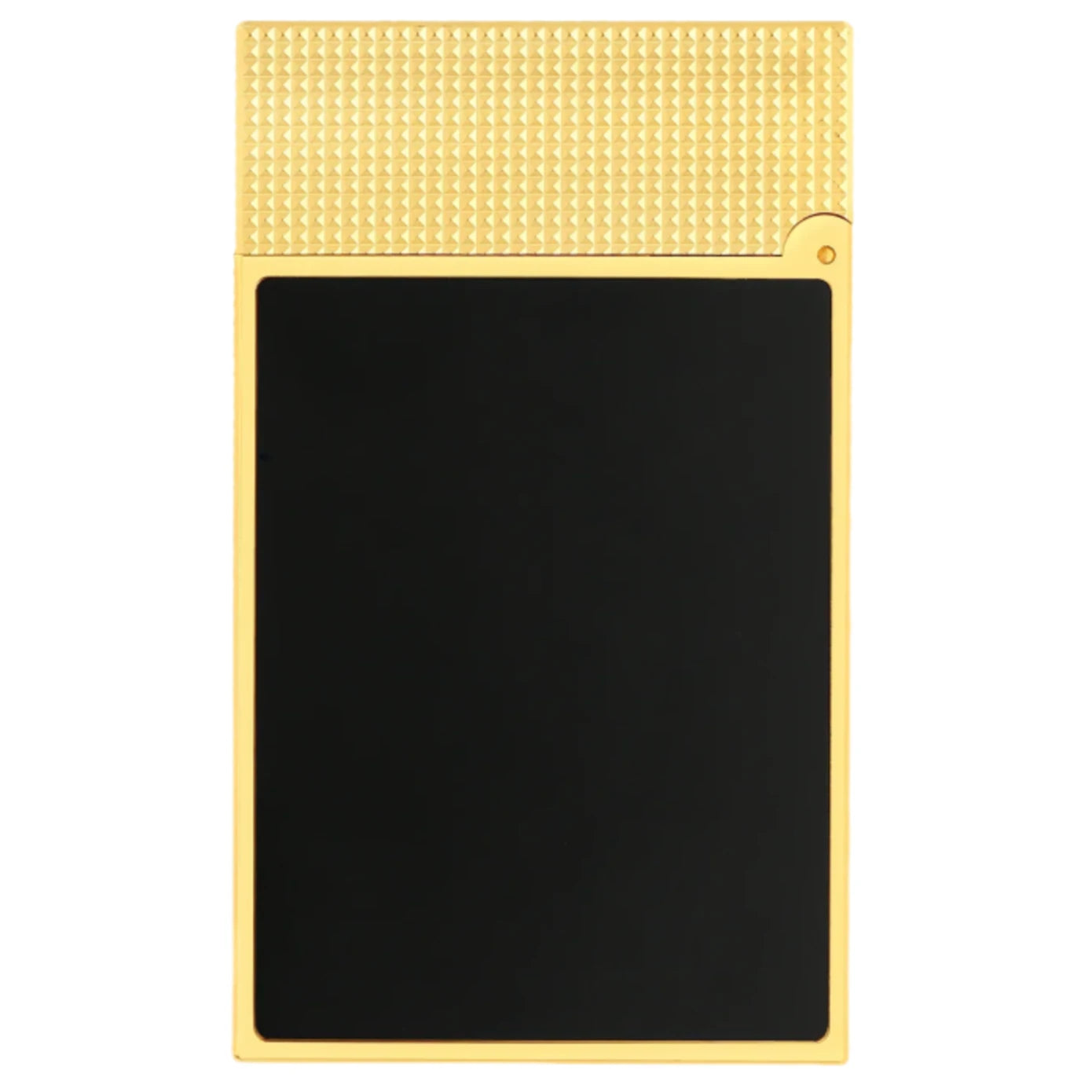 A full-sized classic Line 2 lighter featuring a yellow gold micro-diamond head pattern with black lacquer and a perfect ping.