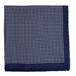 Handmade in England, Sovereign Grade 100% Silk Navy Repeating White Star Pocket Square by KirbyAllison.com. A formal Sovereign Grade 100% Silk White Repeating Black Star pocket square adorned with black dots to enhance your wardrobe, available at KirbyAllison.com.