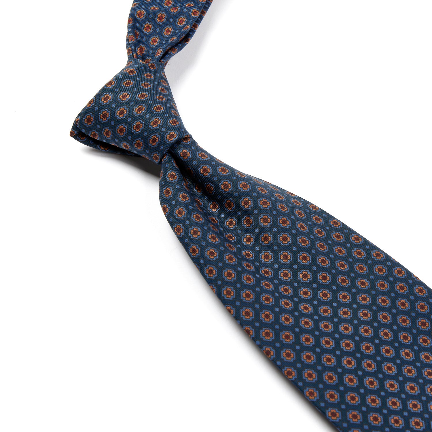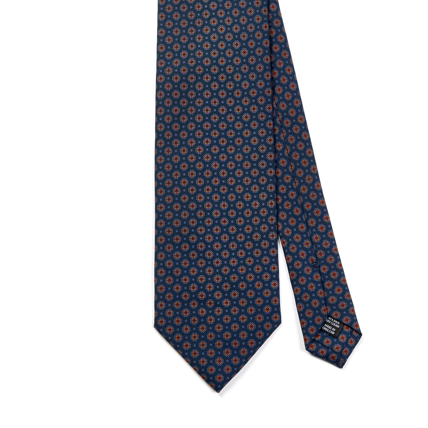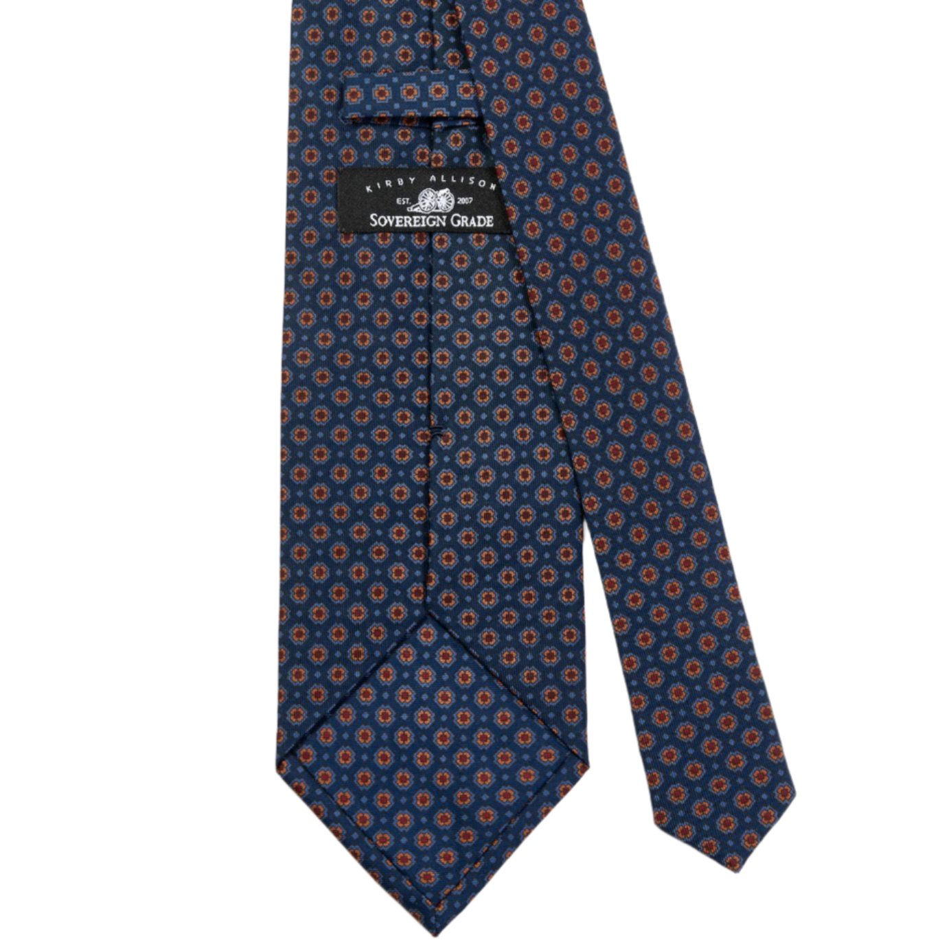 A Sovereign Grade Rust Small Floral Ancient Madder Tie by KirbyAllison.com, handmade in the United Kingdom. A Sovereign Grade Blue Small Floral Ancient Madder Tie from KirbyAllison.com, with a blue and orange pattern of the highest quality. A high-quality Sovereign Grade Dark Navy Small Floral Ancient Madder Tie, handmade in the United Kingdom and available on KirbyAllison.com.