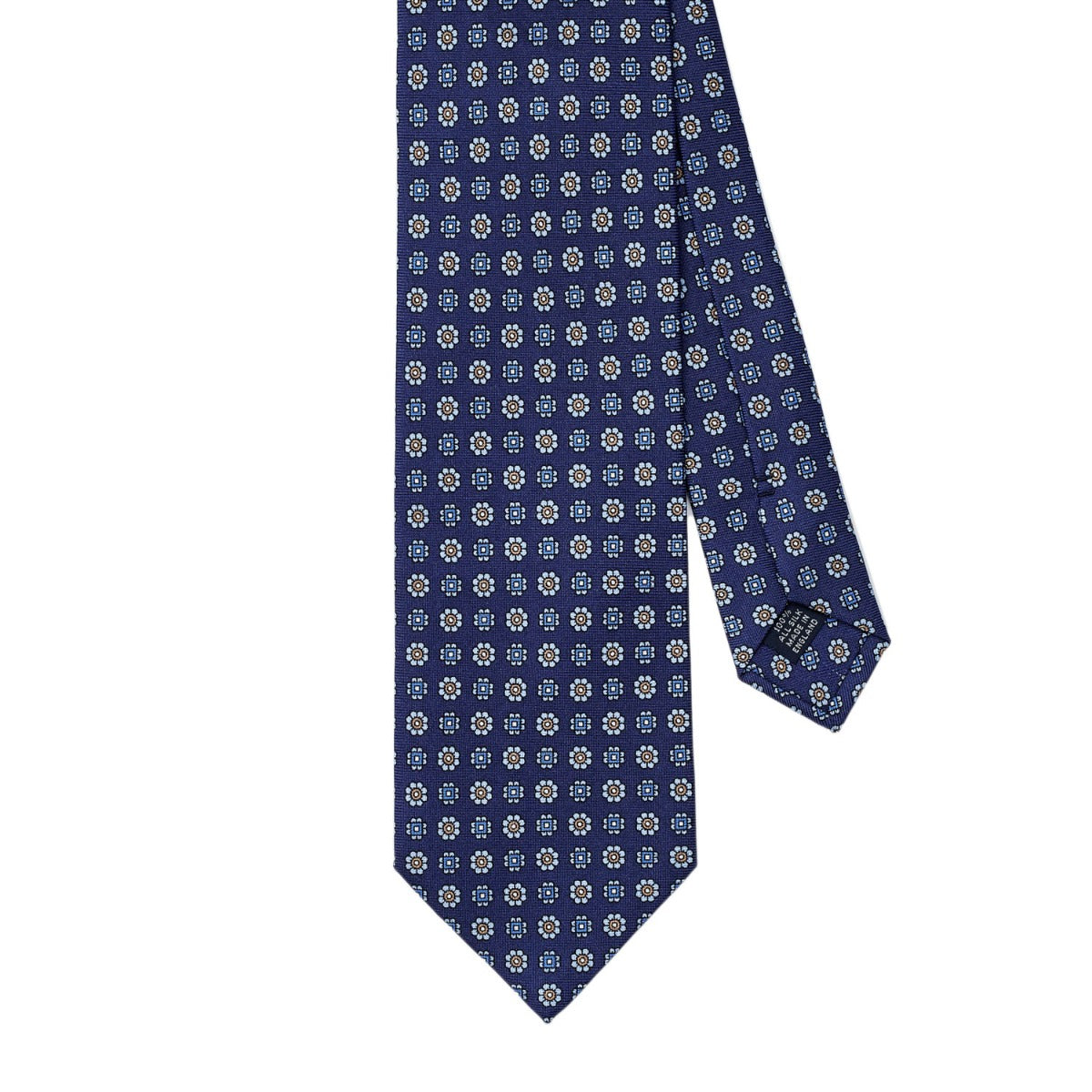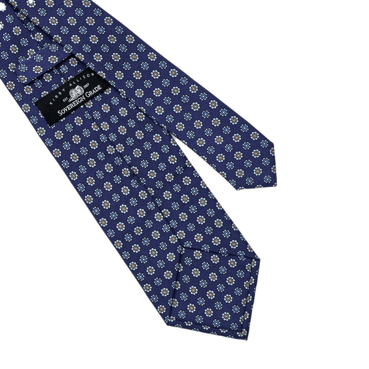 A Sovereign Grade Rust Small Floral Ancient Madder Tie by KirbyAllison.com, handmade in the United Kingdom. A Sovereign Grade Blue Small Floral Ancient Madder Tie from KirbyAllison.com, with a blue and orange pattern of the highest quality. A high-quality Sovereign Grade Dark Navy Small Floral Ancient Madder Tie, handmade in the United Kingdom and available on KirbyAllison.com.