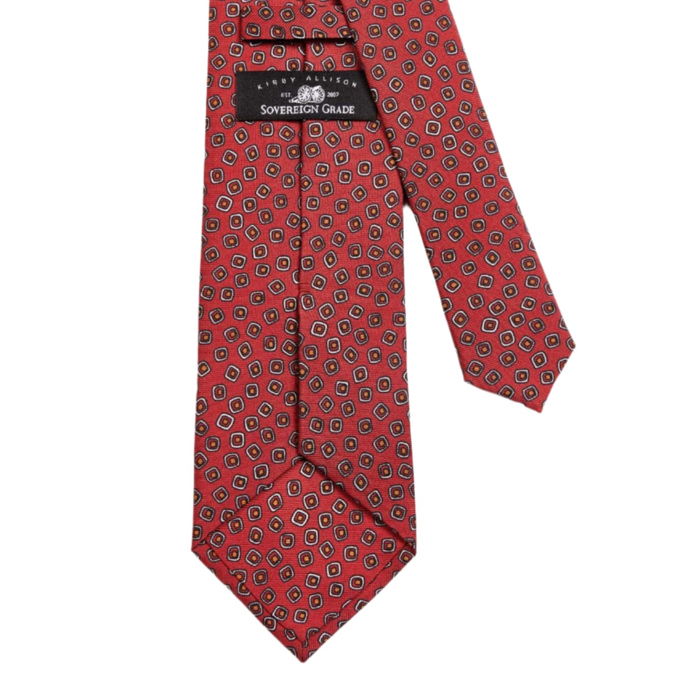 A Sovereign Grade Burgundy Art Deco Ancient Madder Silk Tie with blue and red diamonds of quality craftsmanship, made in the United Kingdom from KirbyAllison.com. A Sovereign Grade Forrest Green Art Deco Ancient Madder Silk Tie from KirbyAllison.com of the highest quality with green, red and blue diamonds. A Sovereign Grade Rust Art Deco Ancient Madder Silk Tie from KirbyAllison.com, with a blue and red pattern, made in the United Kingdom. A handmade KirbyAllison.com Sovereign Grade Dark Navy Art Deco Ancient Madder Silk Tie. A KirbyAllison.com Sovereign Grade Navy w/Green Art Deco Ancient Madder tie with a diamond pattern of quality. A Sovereign Grade Oxblood Art Deco Jacquard Tie, 150 cm with blue squares, showcasing quality craftsmanship from KirbyAllison.com.