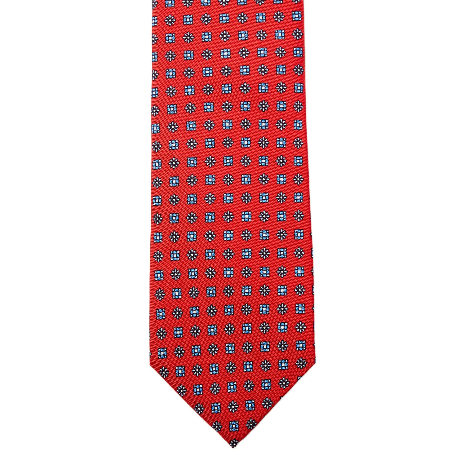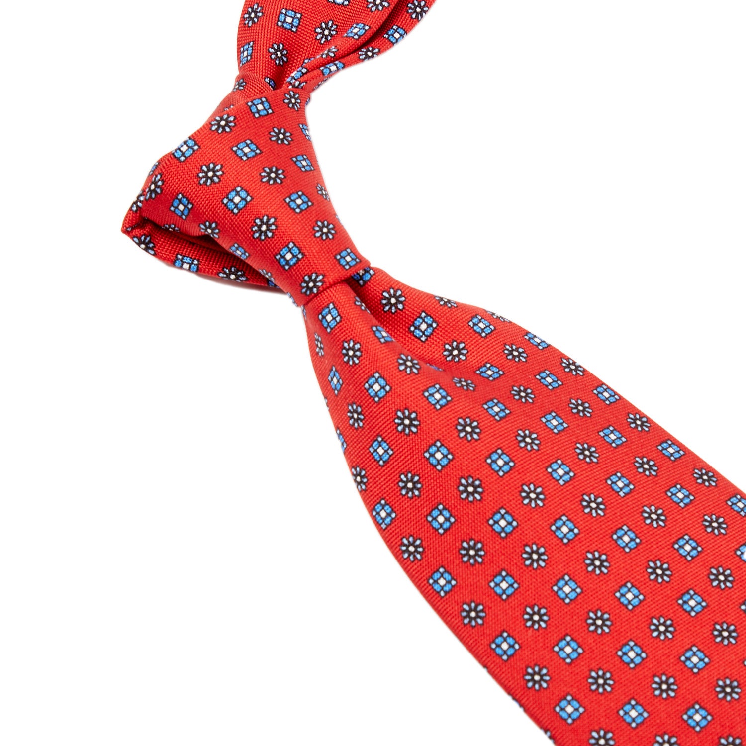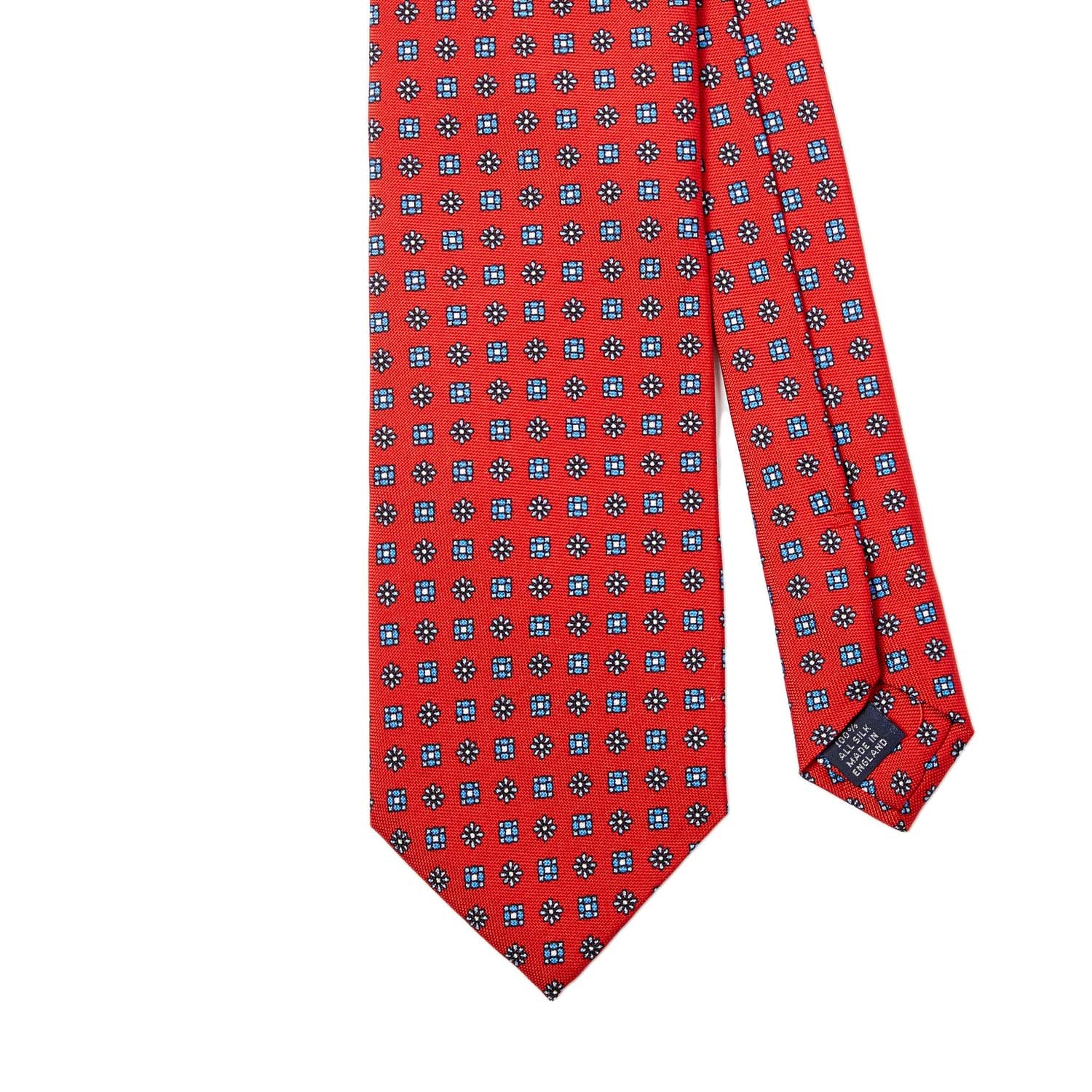 A Sovereign Grade Baby Blue Floral 25oz Silk Hopsack Tie (150x8.5 cm) with superior craftsmanship. Manufactured by KirbyAllison.com. A Sovereign Grade Red Floral 25oz Silk Hopsack Tie (150x8.5 cm) from KirbyAllison.com with white polka dots. A Sovereign Grade Red Floral 25 oz Hopsack Silk Tie with circular patterns on a blue background, sold by KirbyAllison.com. Handmade in the United Kingdom, this Sovereign Grade Navy Floral 25oz Silk Hopsack Tie (150x8.5 cm) from KirbyAllison.com features a red, orange, and blue pattern showcasing quality craftsmanship. A Sovereign Grade Navy Hopsack tie, 150 cm from KirbyAllison.com, with a floral pattern. A Sovereign Grade Cream Floral 25oz Silk Hopsack tie (150x8.5 cm) from KirbyAllison.com with a black and blue pattern showcasing excellent craftsmanship.