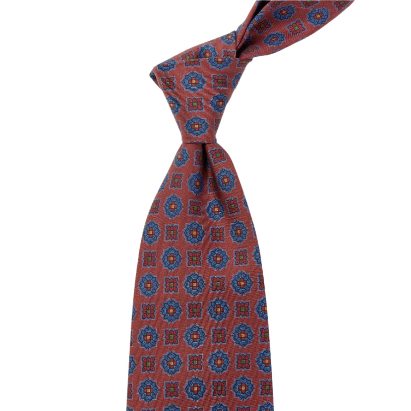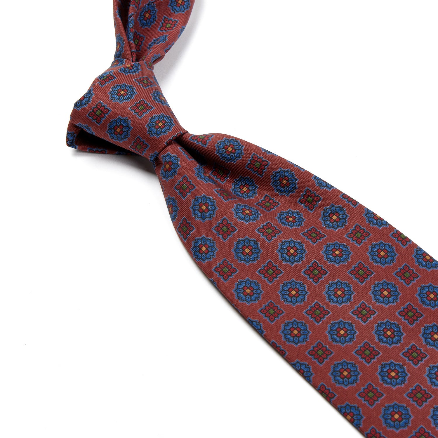 A handmade Sovereign Grade Rust Floral Diamond Ancient Madder tie with blue and red designs from KirbyAllison.com ties.