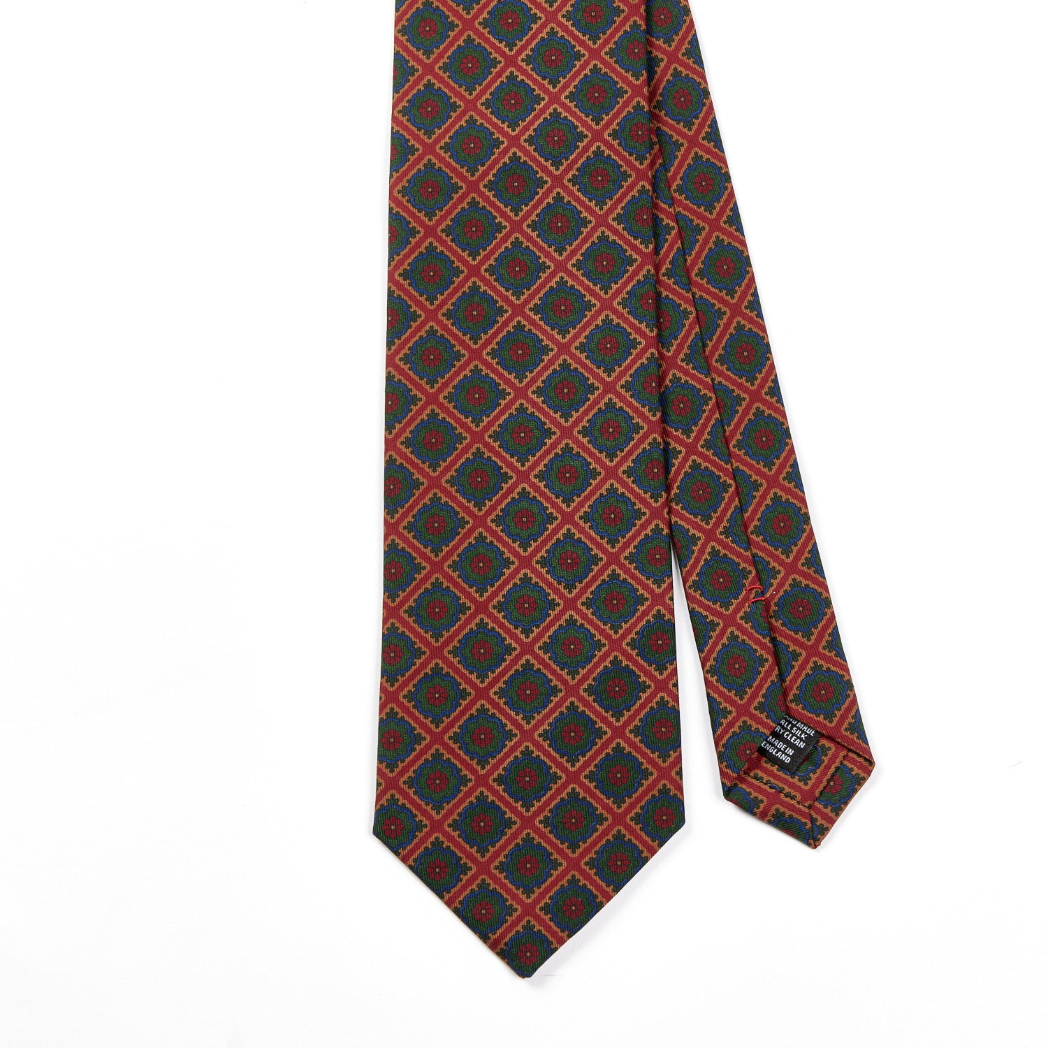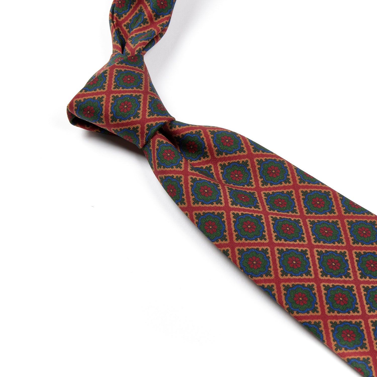 A KirbyAllison.com Sovereign Grade Navy/Ochre Oversized Medallion Ancient Madder Tie, handmade in the United Kingdom using 100% English silk. A Sovereign Grade Dark Navy/Red Oversized Medallion Ancient Madder Tie, crafted from 100% English silk by KirbyAllison.com. A handcrafted KirbyAllison.com Sovereign Grade Rust/Green Oversized Medallion Ancient Madder tie with a red and green pattern.
