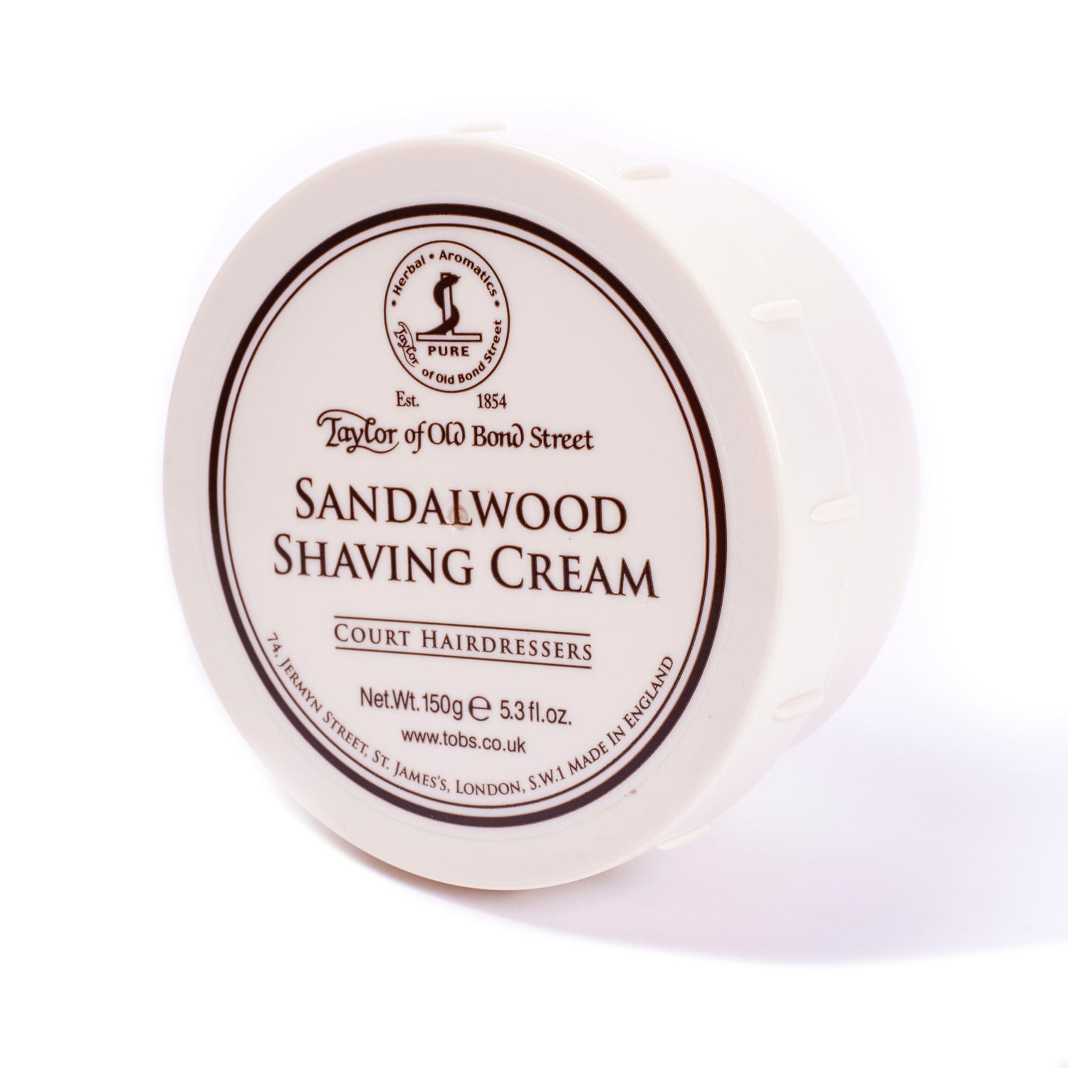 A tin of Almond Shaving Cream Bowl by Taylor of Old Bond Street, sold on KirbyAllison.com, on a white background. A tin of Taylor of Old Bond Street Eton College Shaving Cream with citrus freshness from KirbyAllison.com. KirbyAllison.com Taylor of Old Bond Street Jermyn Street Shaving Cream tin on white background. A 5.3oz tin of Royal Forest Shaving Cream by Taylor of Old Bond Street from KirbyAllison.com. A Taylor of Old Bond Street Tobacco Leaf Shaving Cream from KirbyAllison.com for a wet shave on a white background.