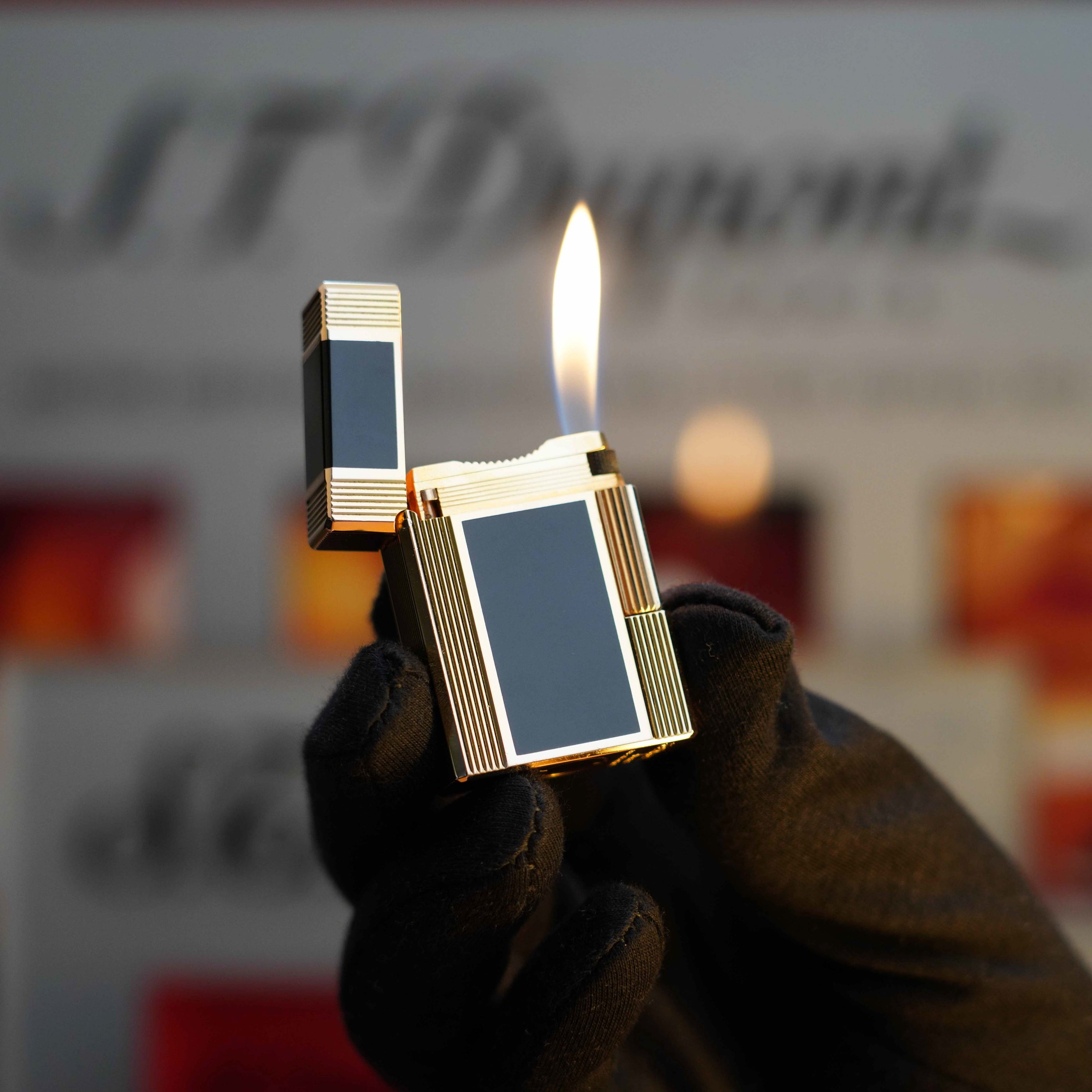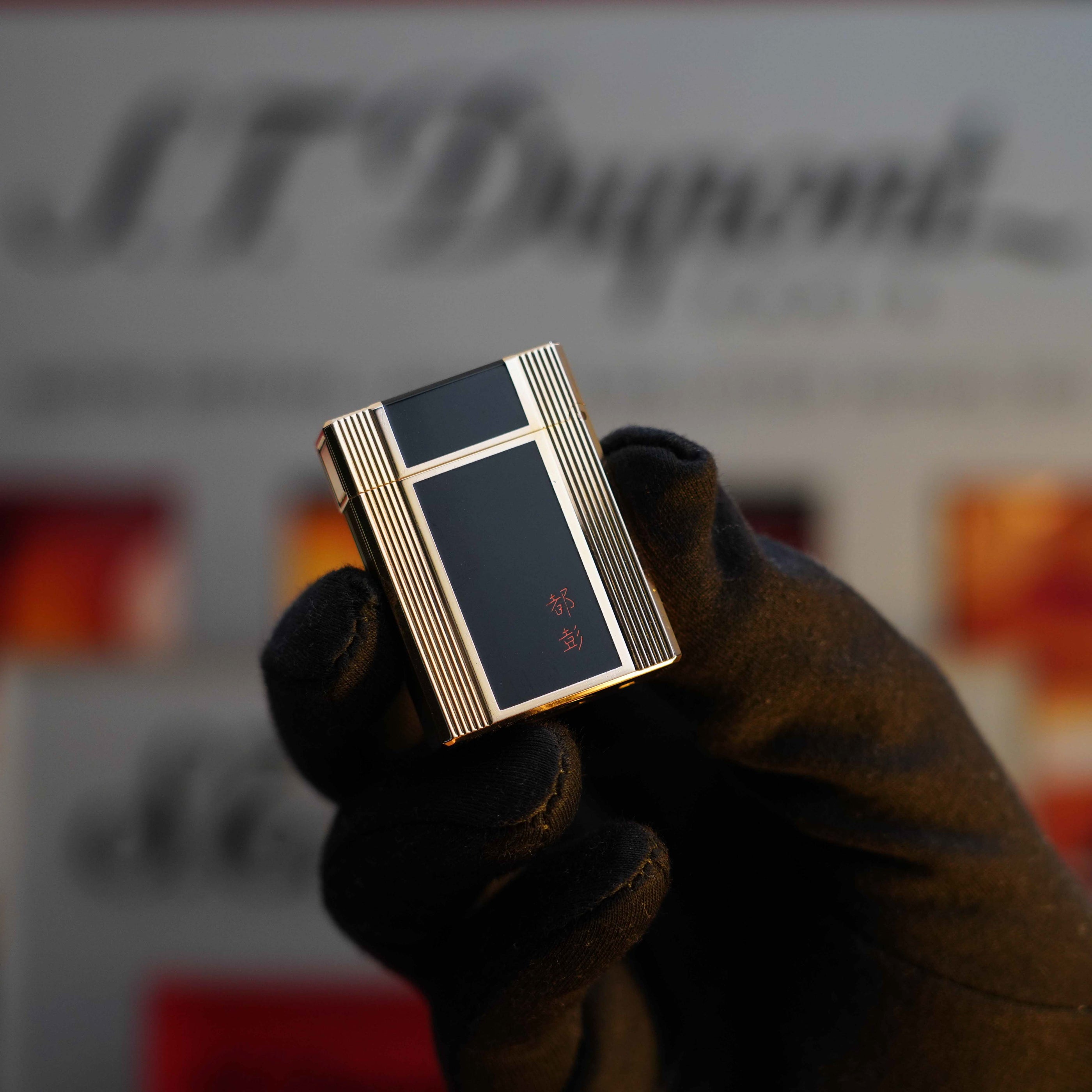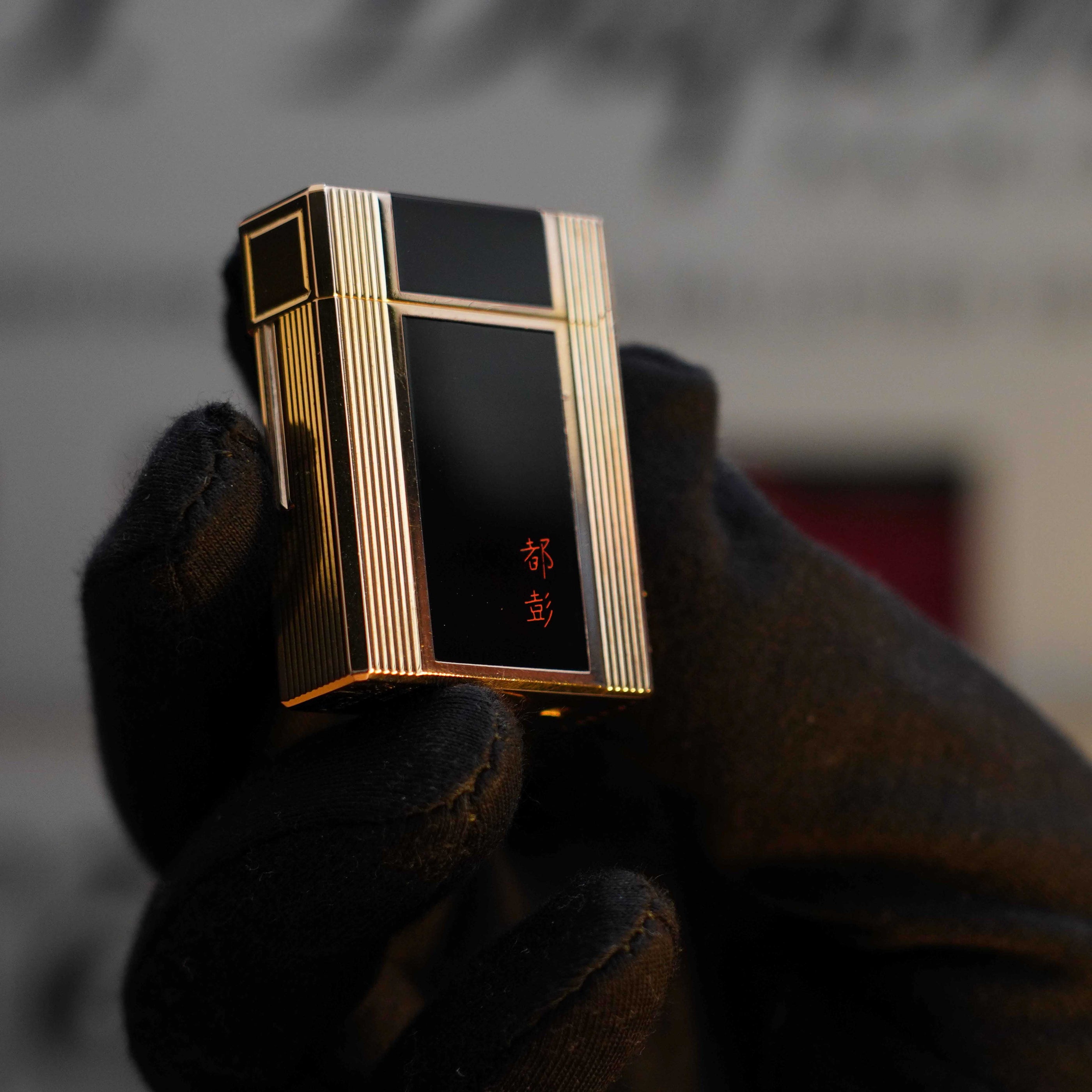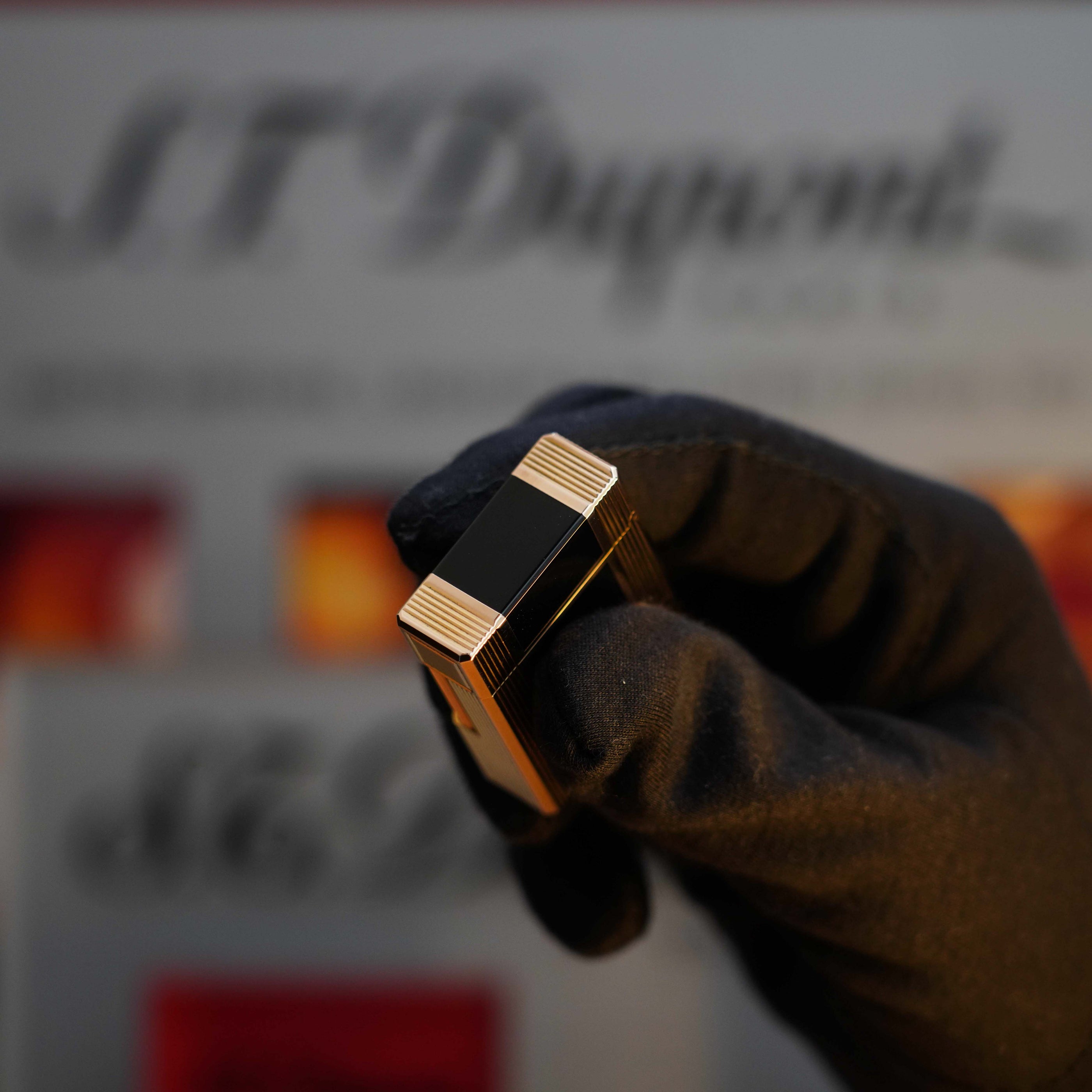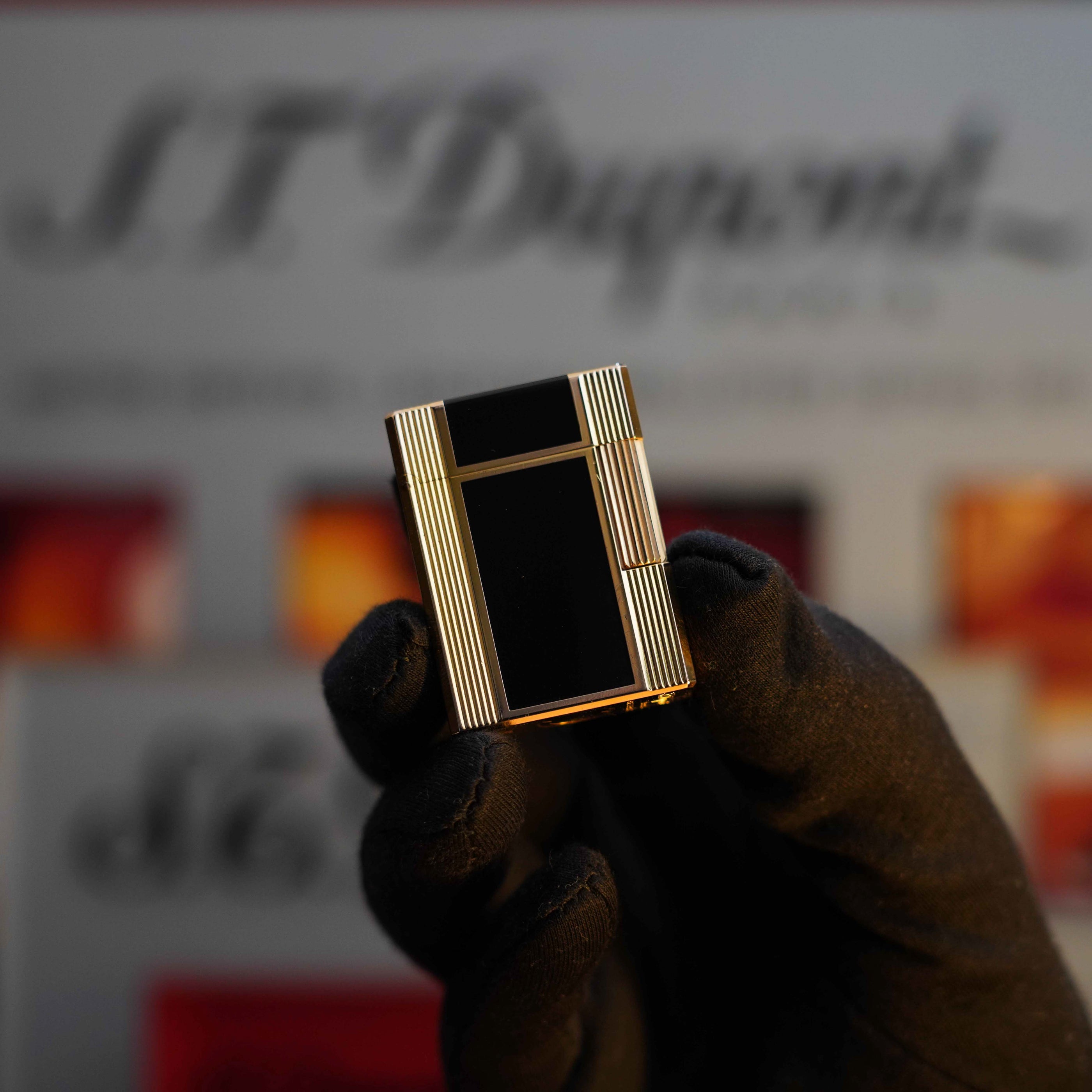 This elegant vintage 1970s S.T. Dupont Ligne 1 Short Lighter, finished in 24k gold with rich black natural lacquer, is a rare find from the mini-size Ligne 1 series.