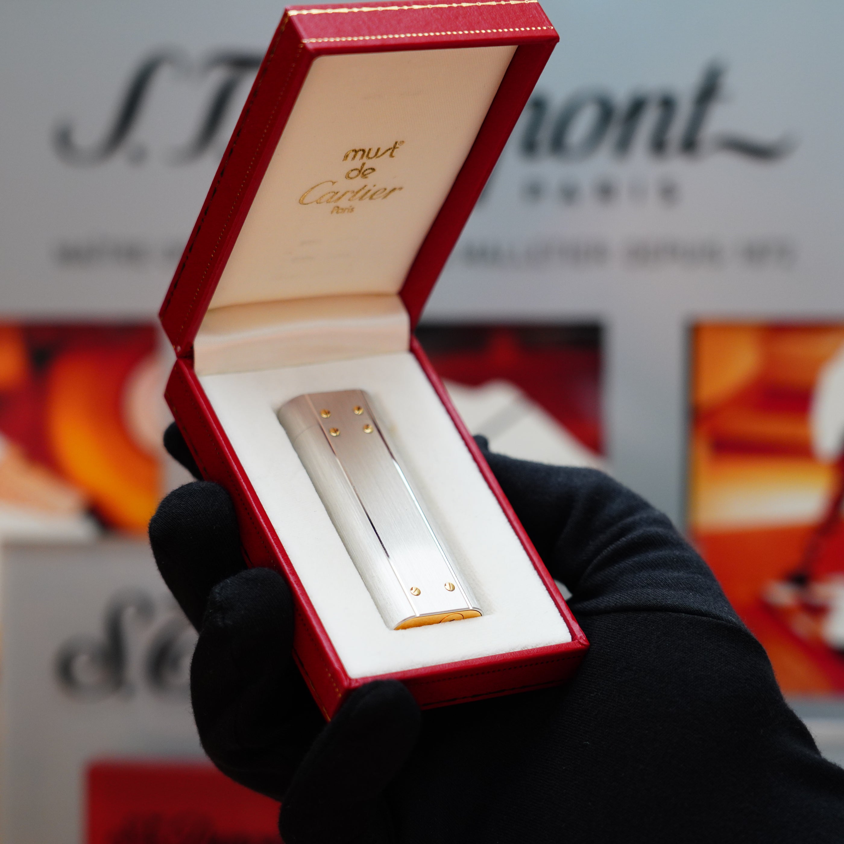 This beautiful Vintage Cartier Santos Palladium Finish with 24k Gold Finish Screw and Heavy Gold Plated Le Must Lighter was crafted in the 1980 .
