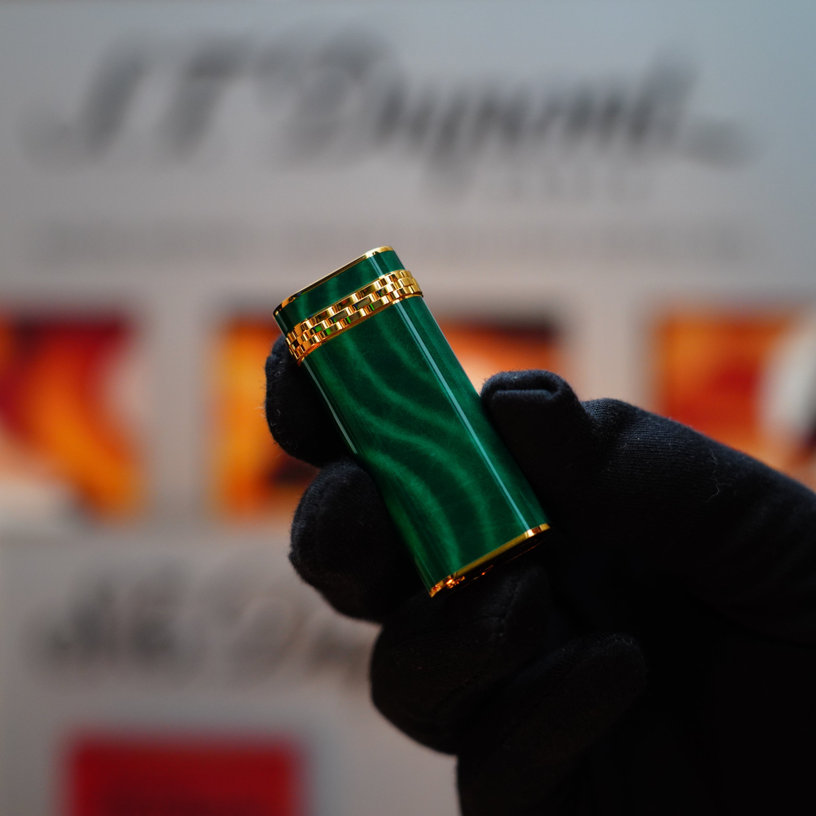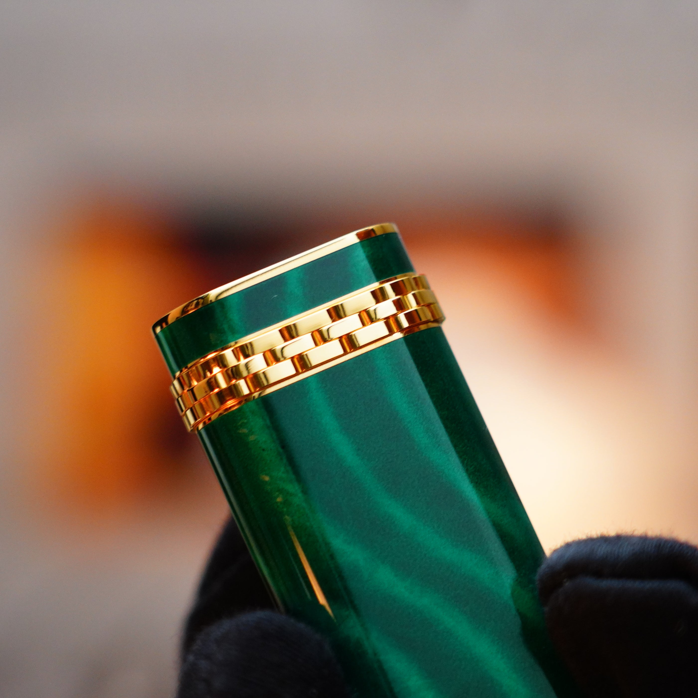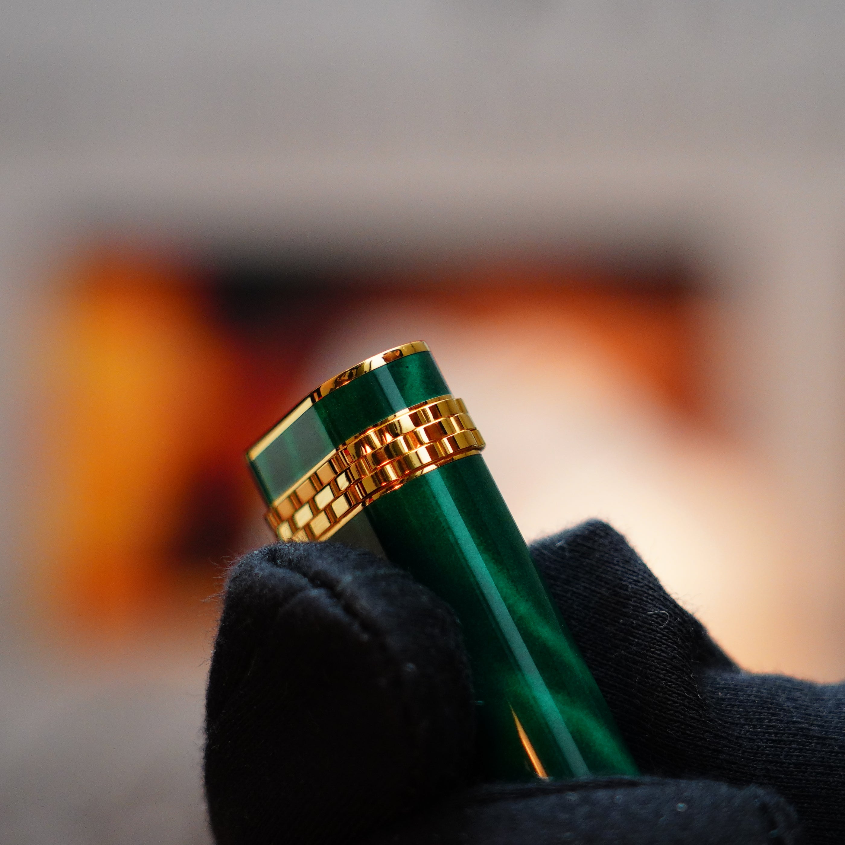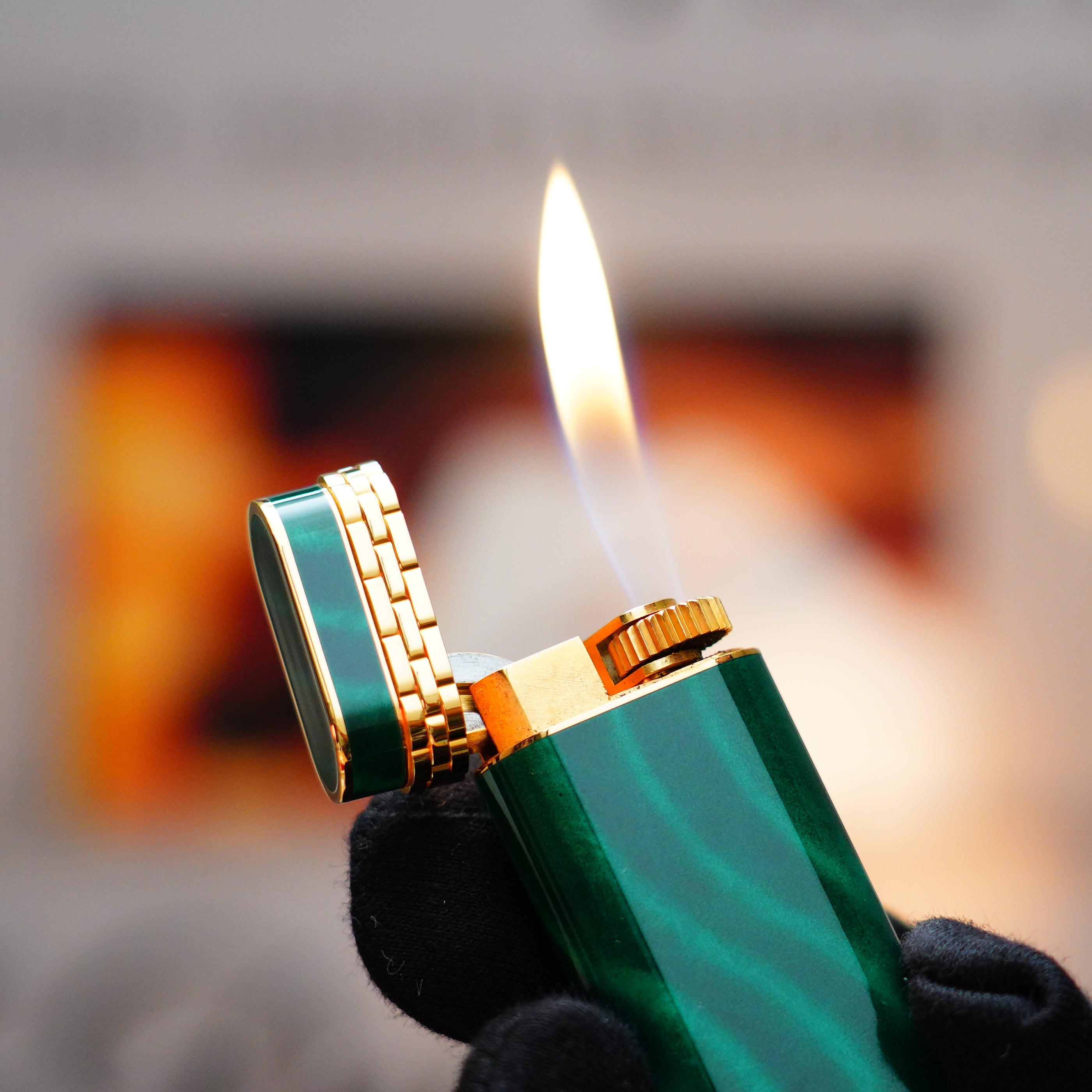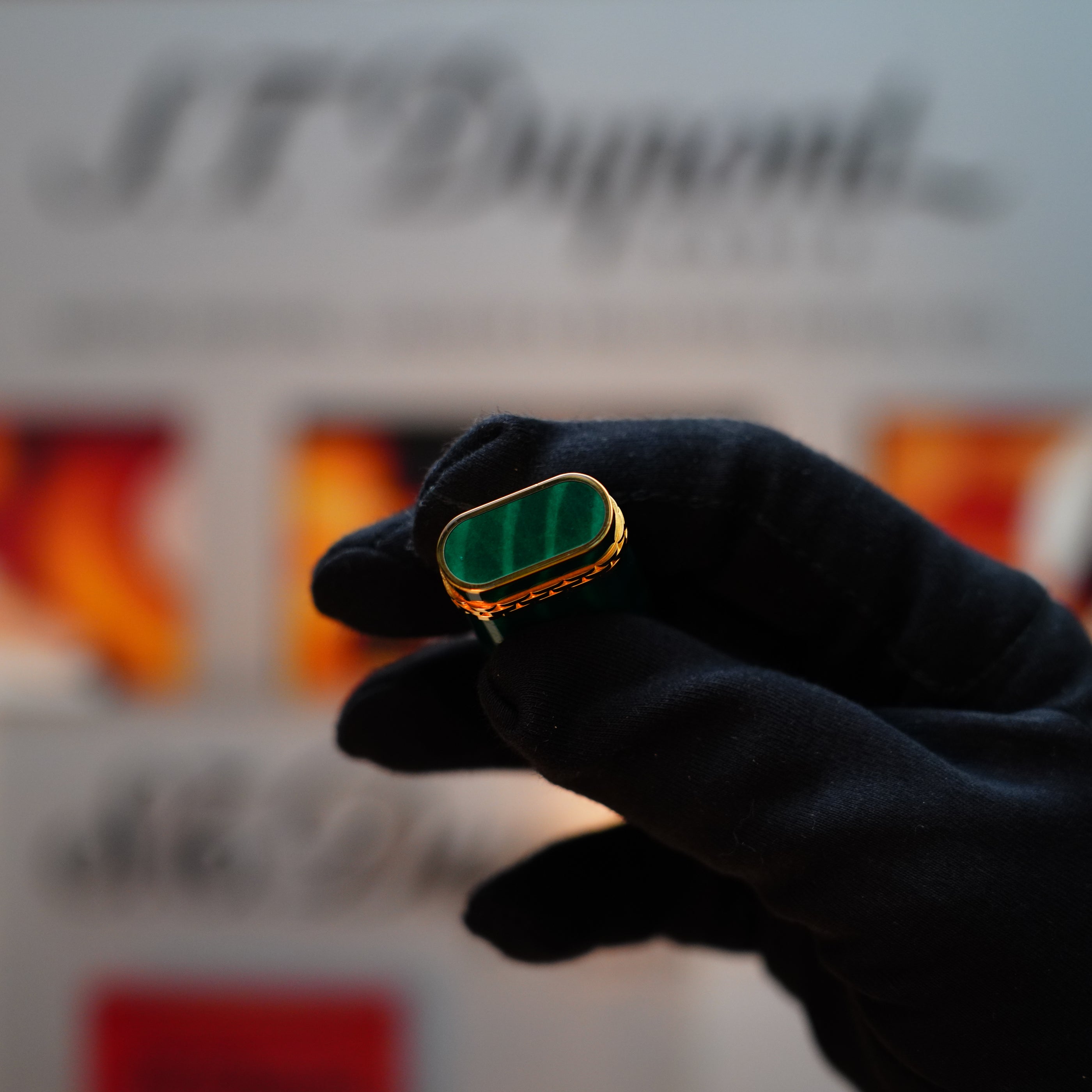 This vintage piece is a rare iconic Mini Size Malachite Gemstone with 18k Gold Ring on Door Lighter made by Cartier ,
