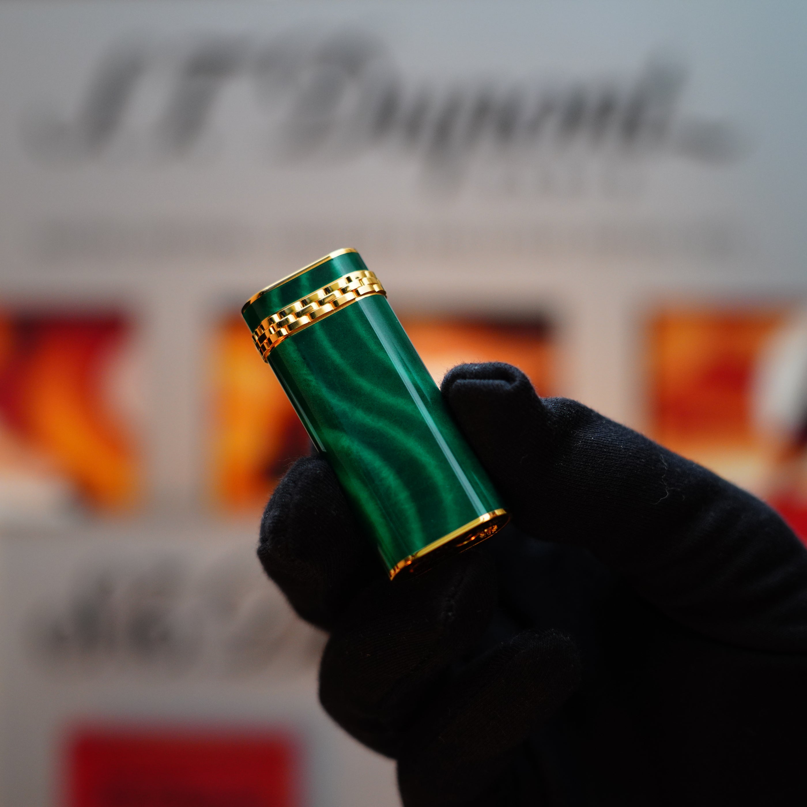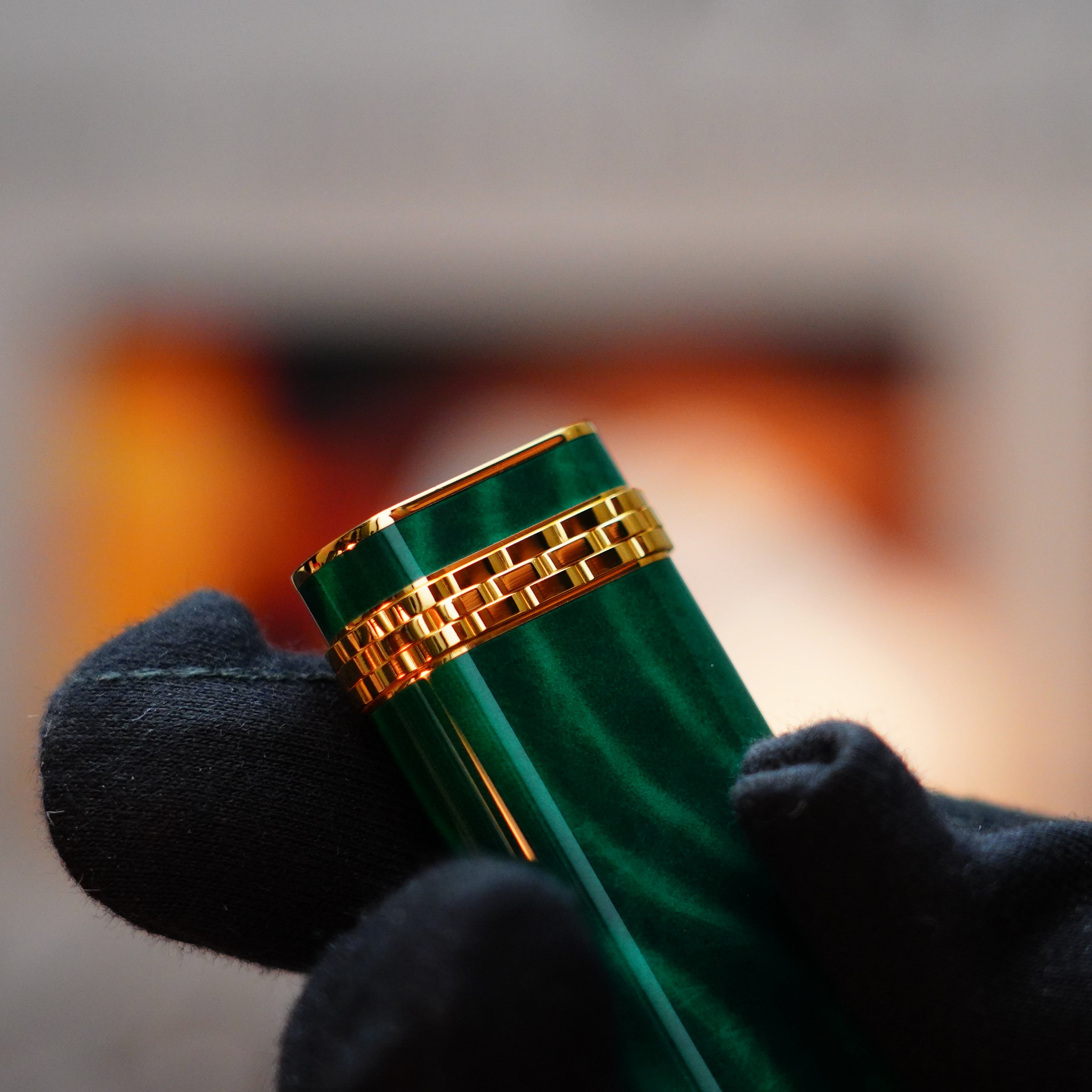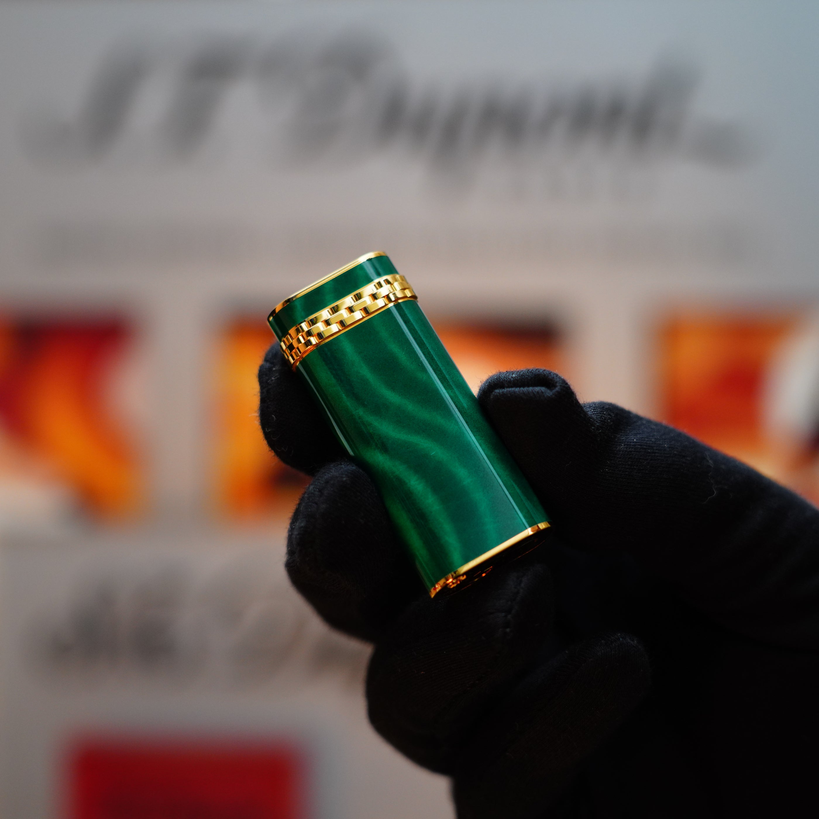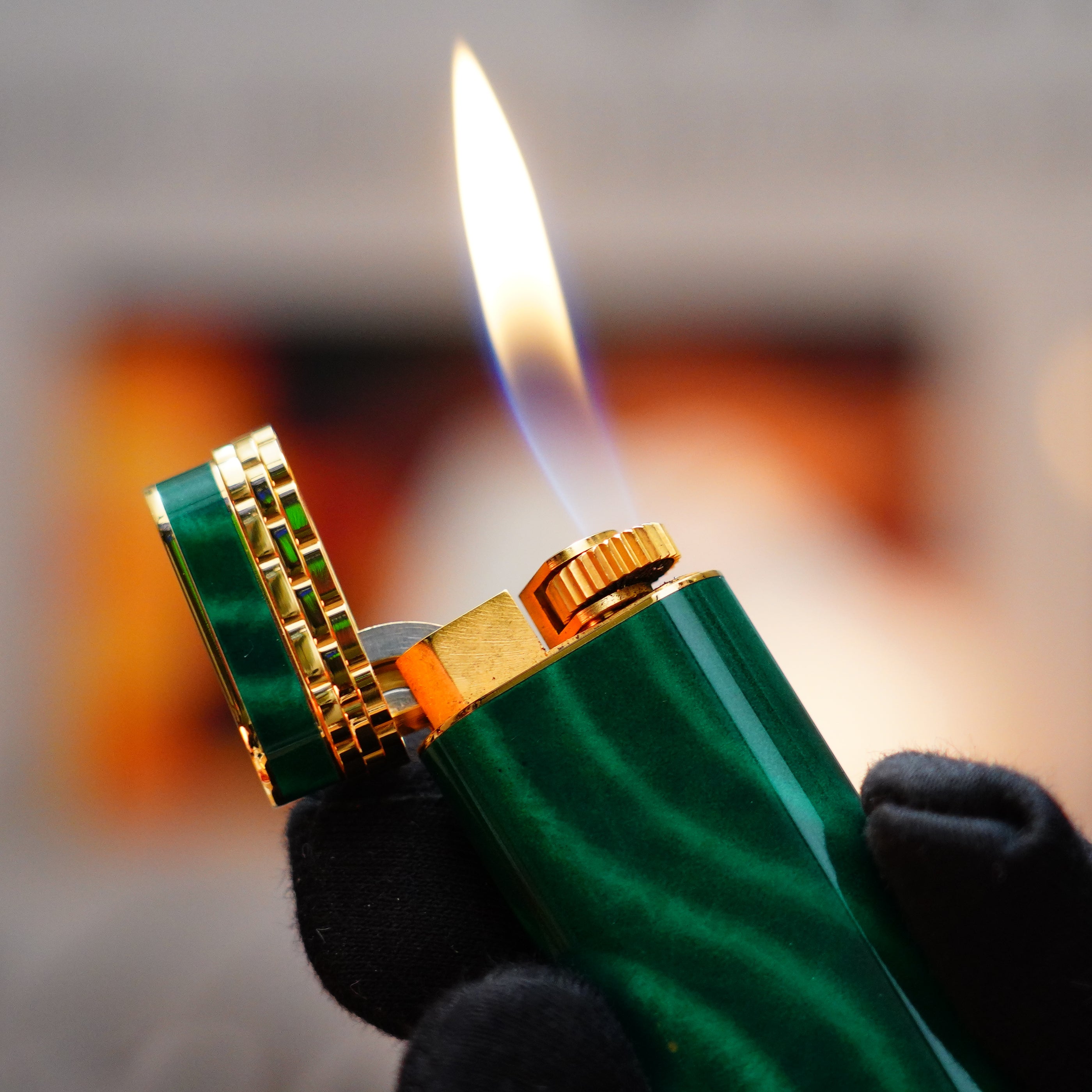 This vintage piece is a rare iconic Mini Size Malachite Gemstone with 18k Gold Ring on Door Lighter made by Cartier ,