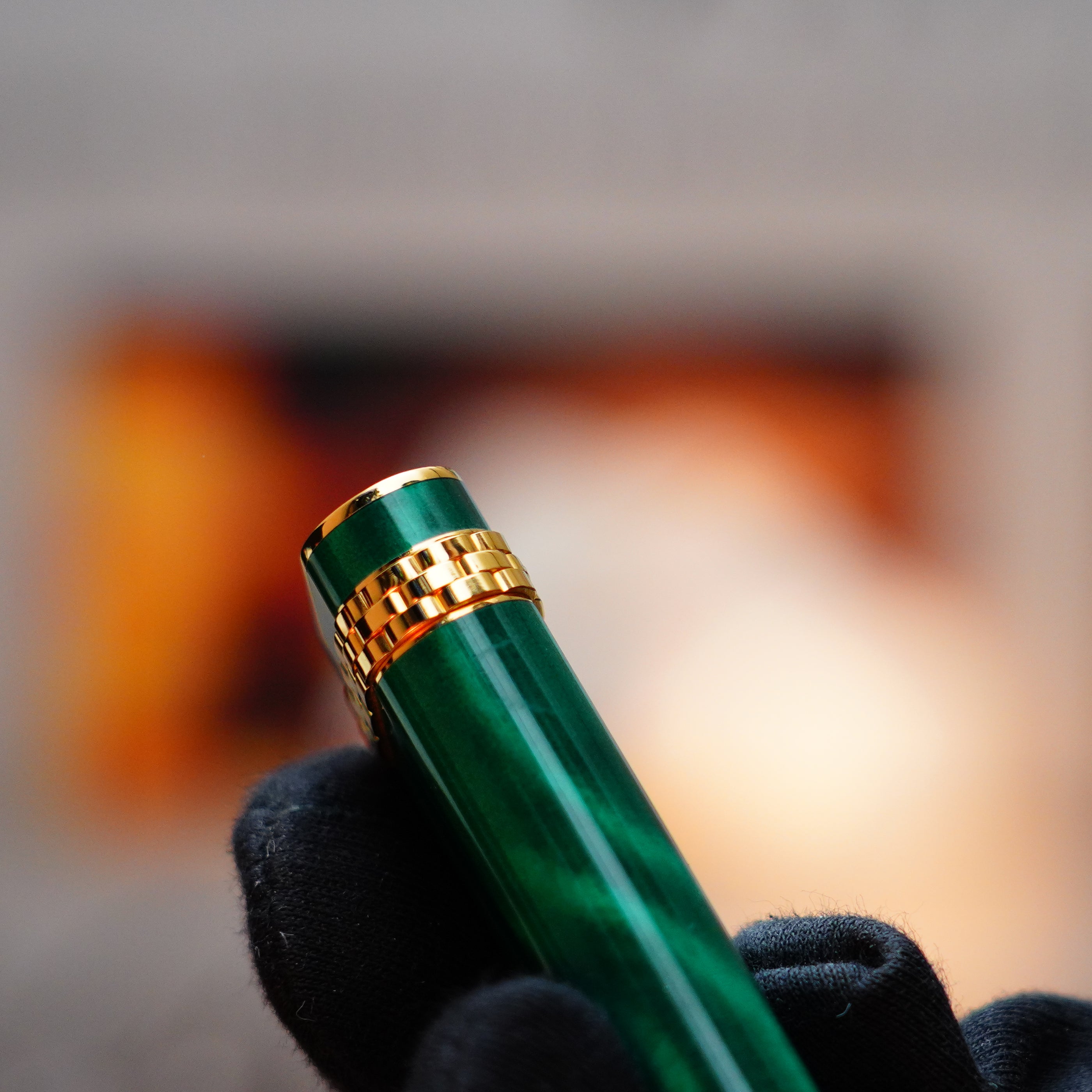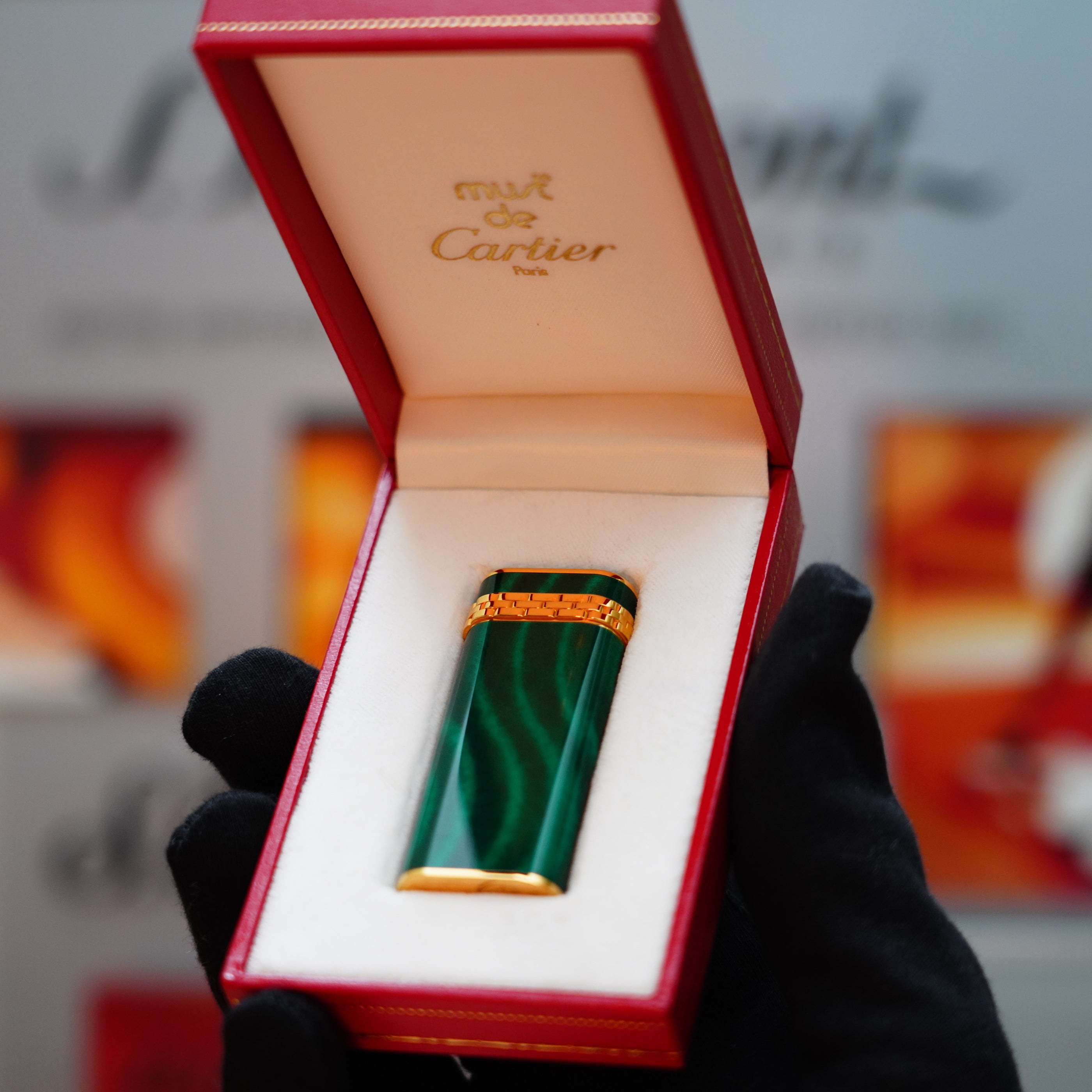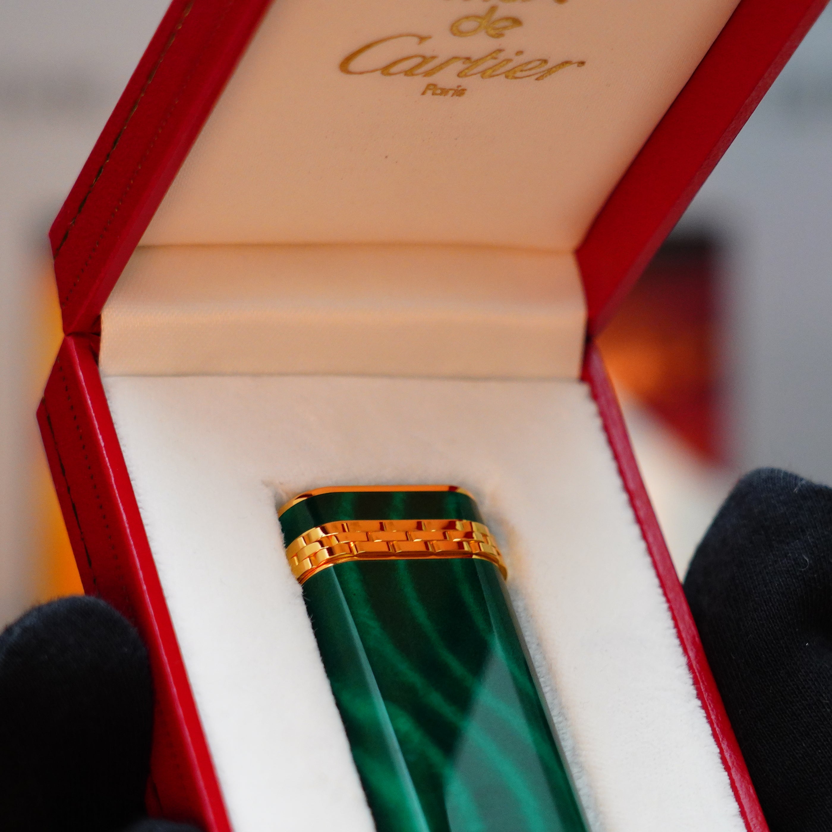 This beautiful Vintage Cartier 24k Gold Finish Rare Lacquer Malachite Gemstone Mini with 18k Gold Ring on Door Lighter was crafted in 1989 !
