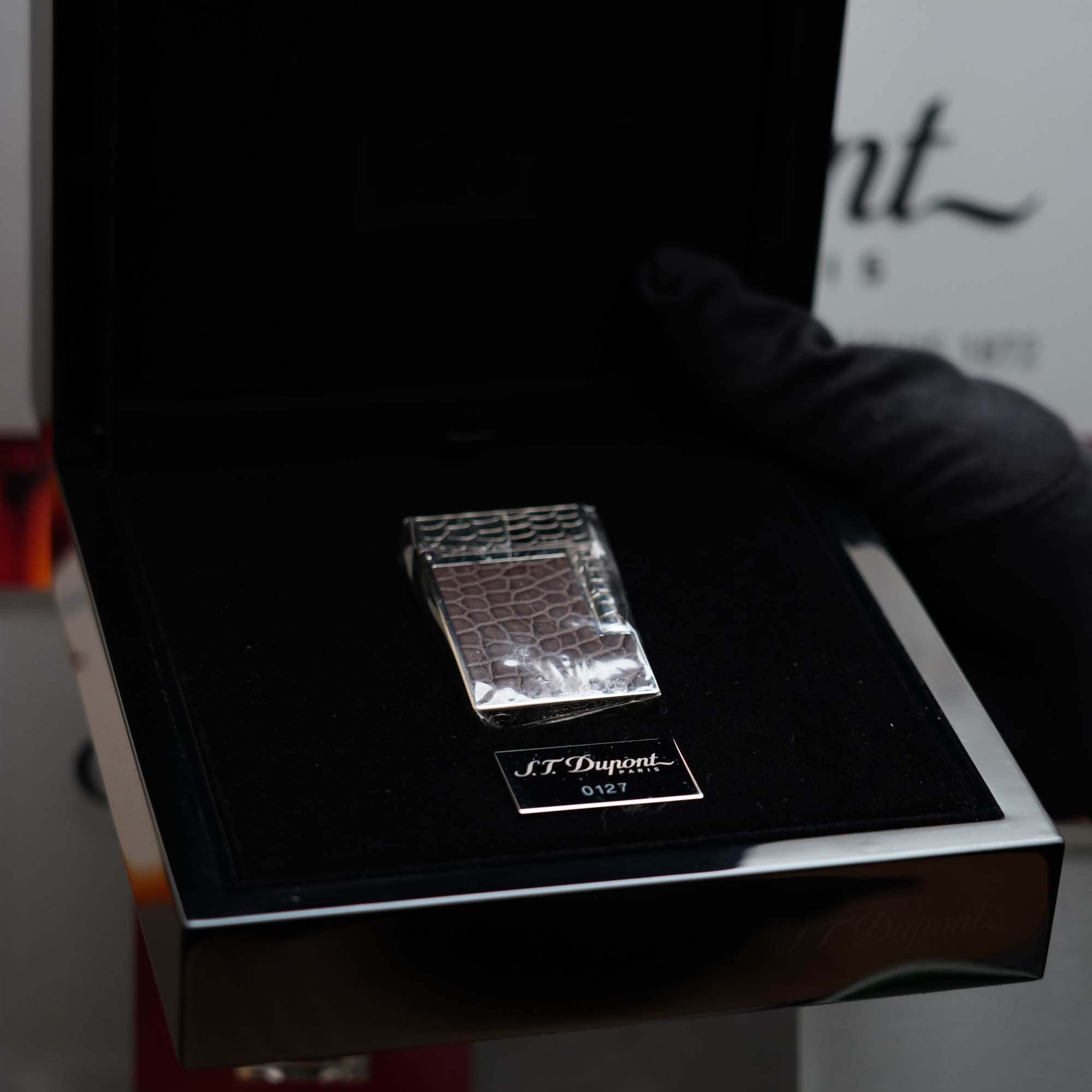 This exceptionally rare, limited-edition vintage 1990s S.T. Dupont Ligne 2 Lighter, featuring exquisite Havane alligator leather and a polished palladium finish, is a true collector’s masterpiece from the prestigious Alligator Series.