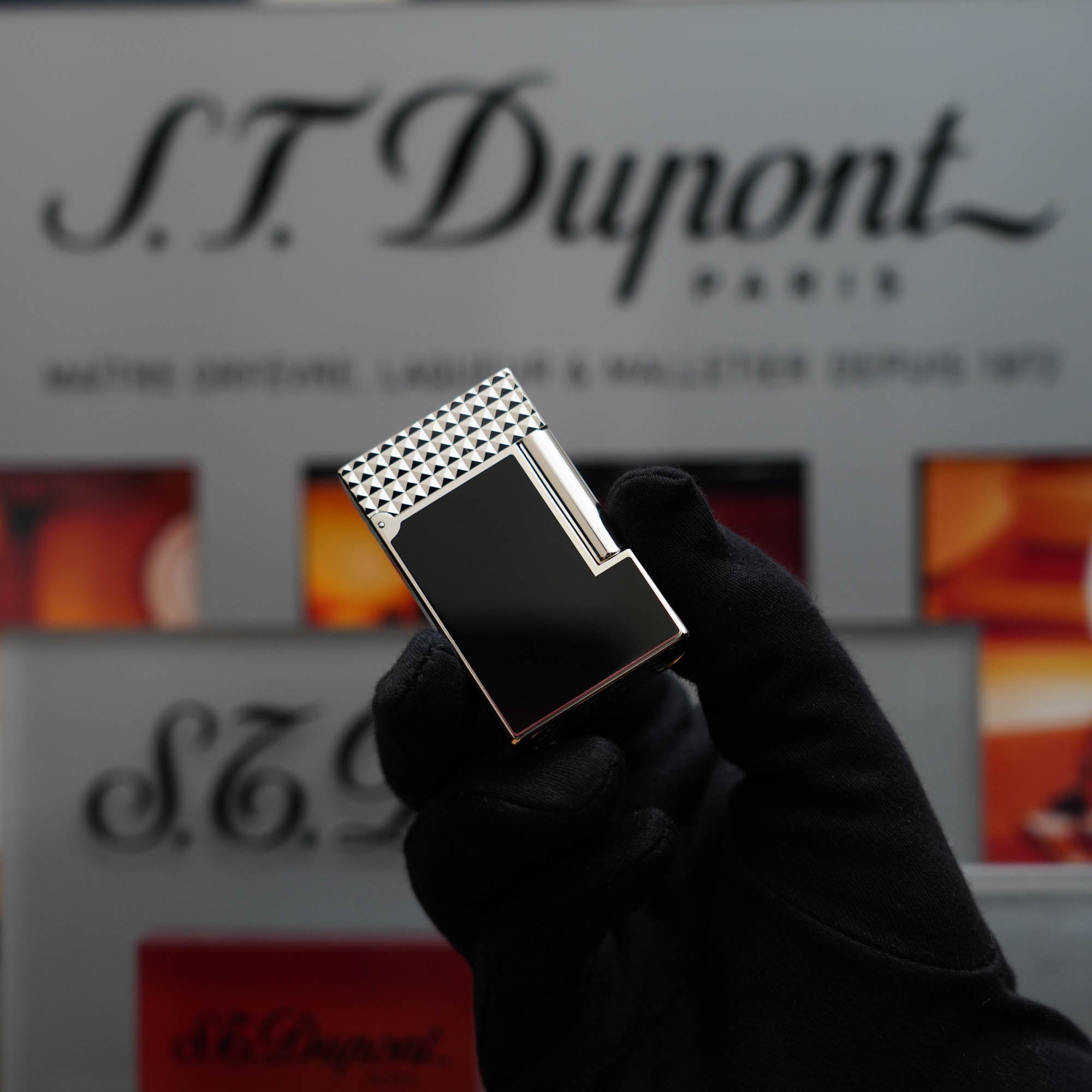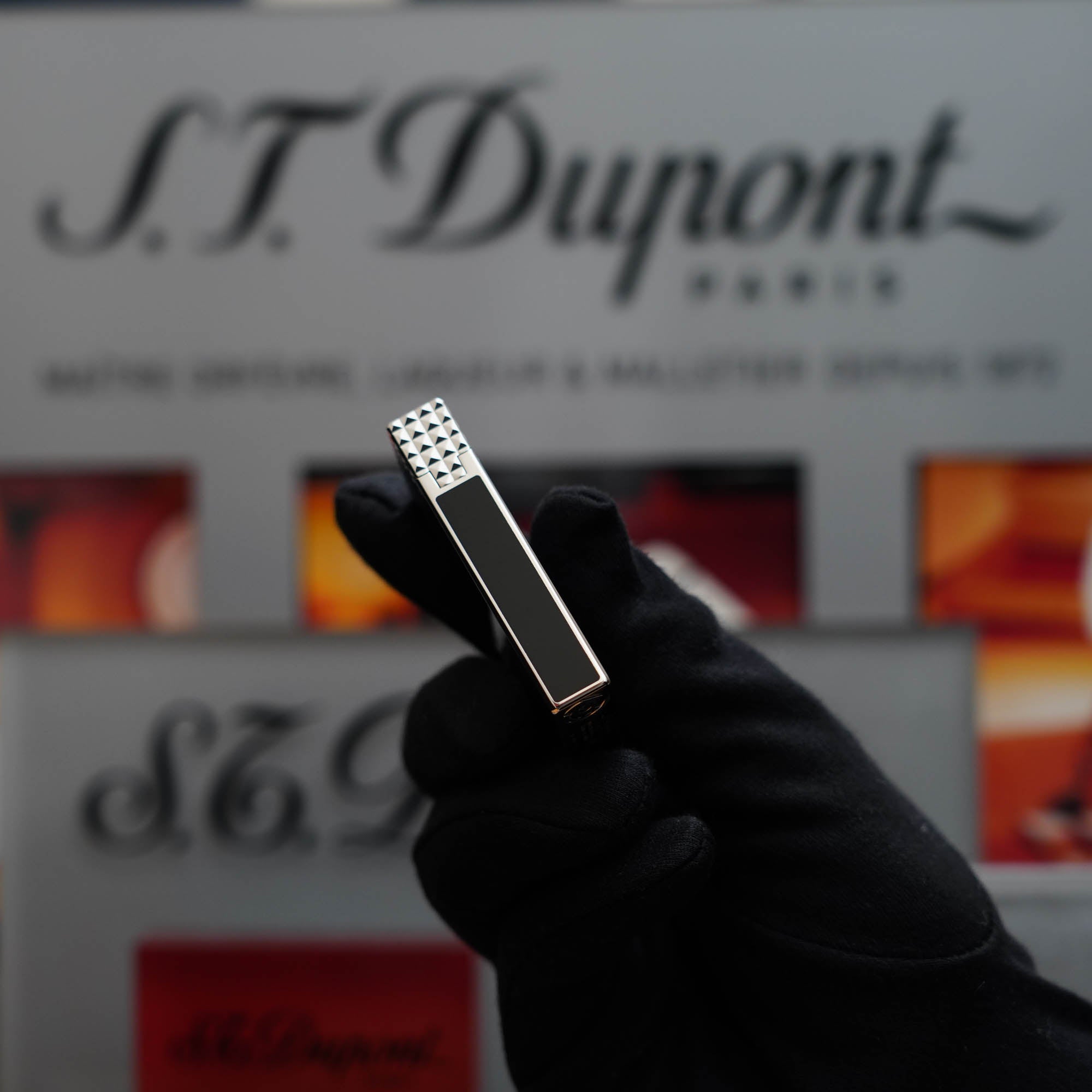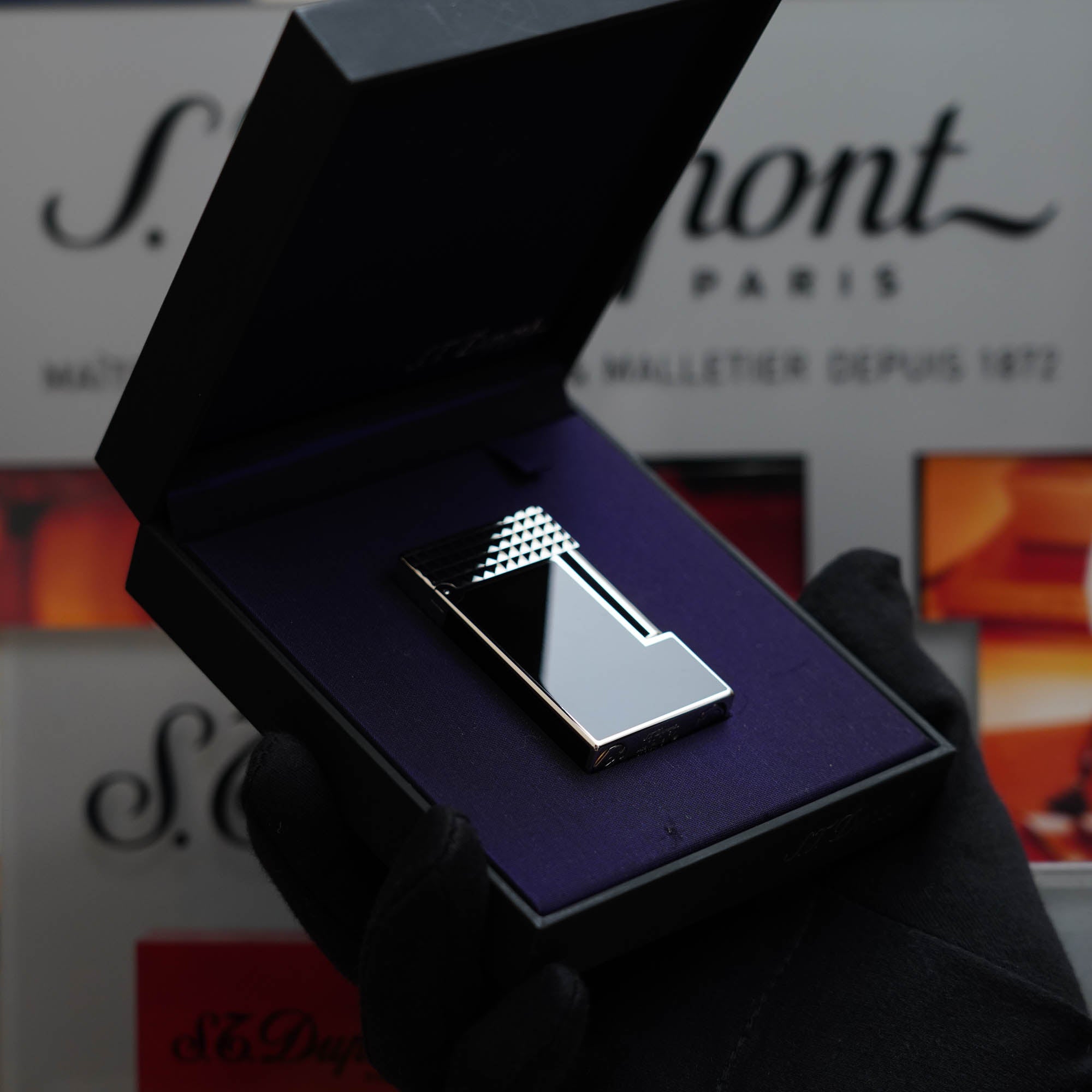 This exquisite vintage S.T. Dupont Montparnasse Ligne 2 "Diamond Door" Lighter, finished in heavy palladium with deep black lacquer accents, was masterfully crafted in the 1990s. A rare and distinguished piece from the Montparnasse Series, it reflects S.T. Dupont's legacy of refined elegance and innovation.