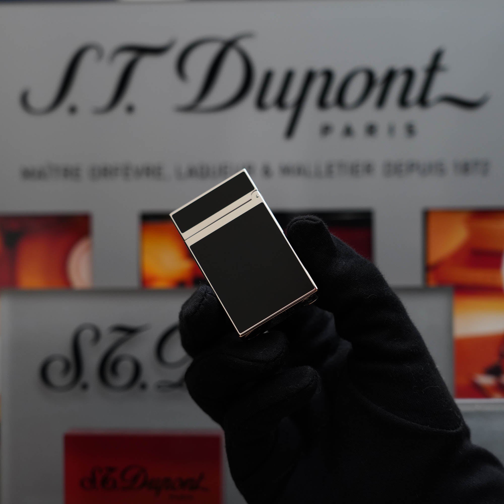 This exquisite S.T. Dupont Montparnasse Ligne 2 Lighter, finished in heavy platinum with natural black lacquer inlays, was expertly crafted in the 1990s.