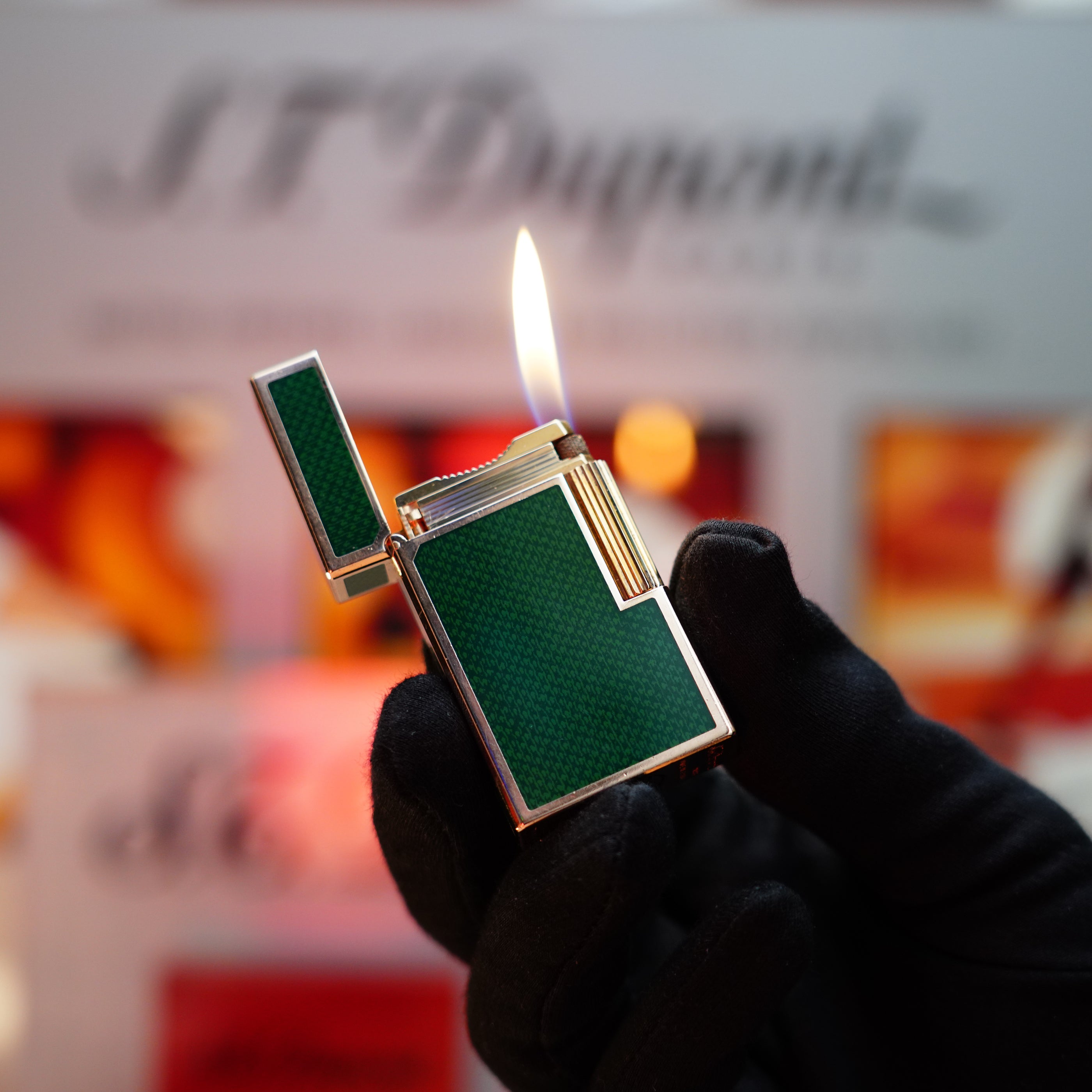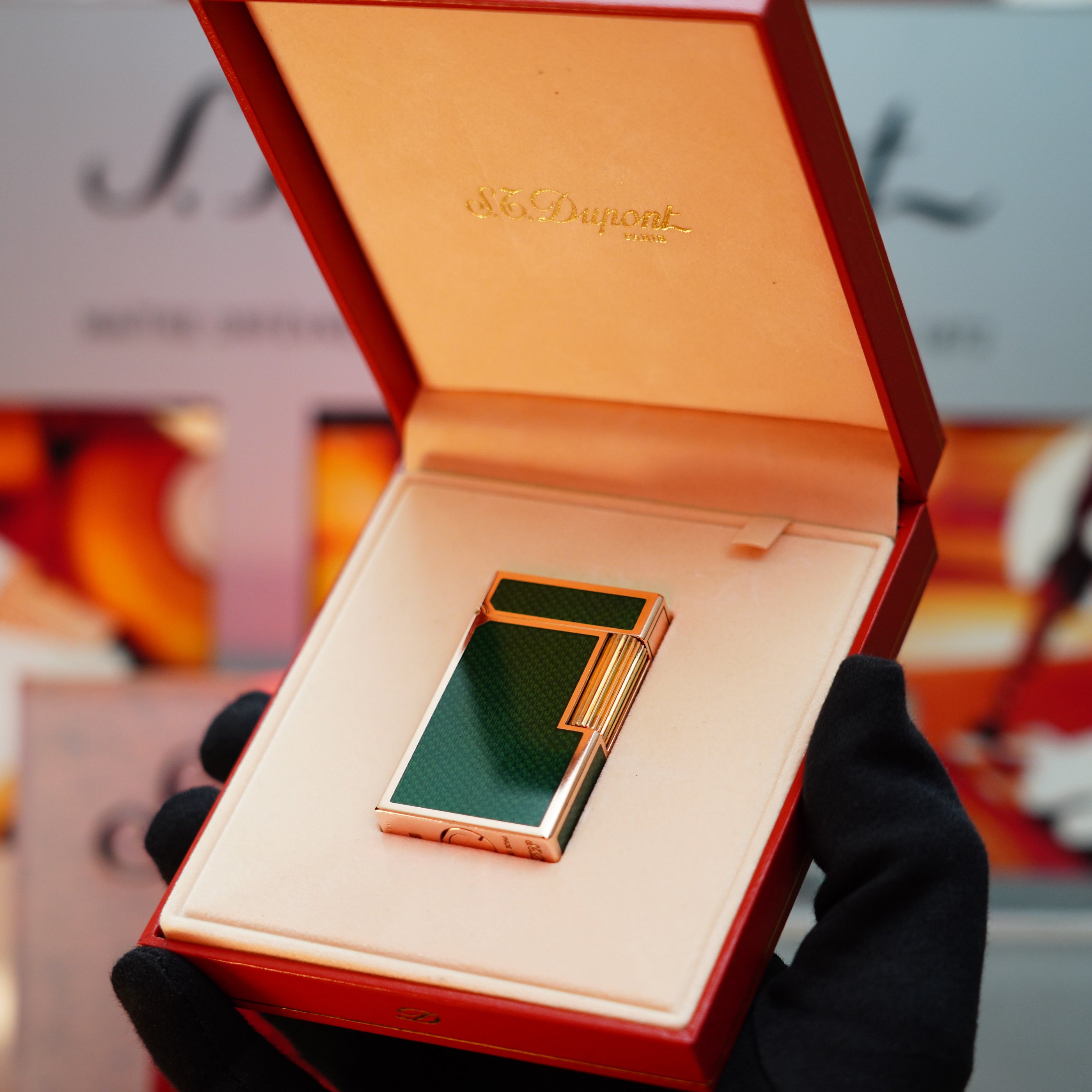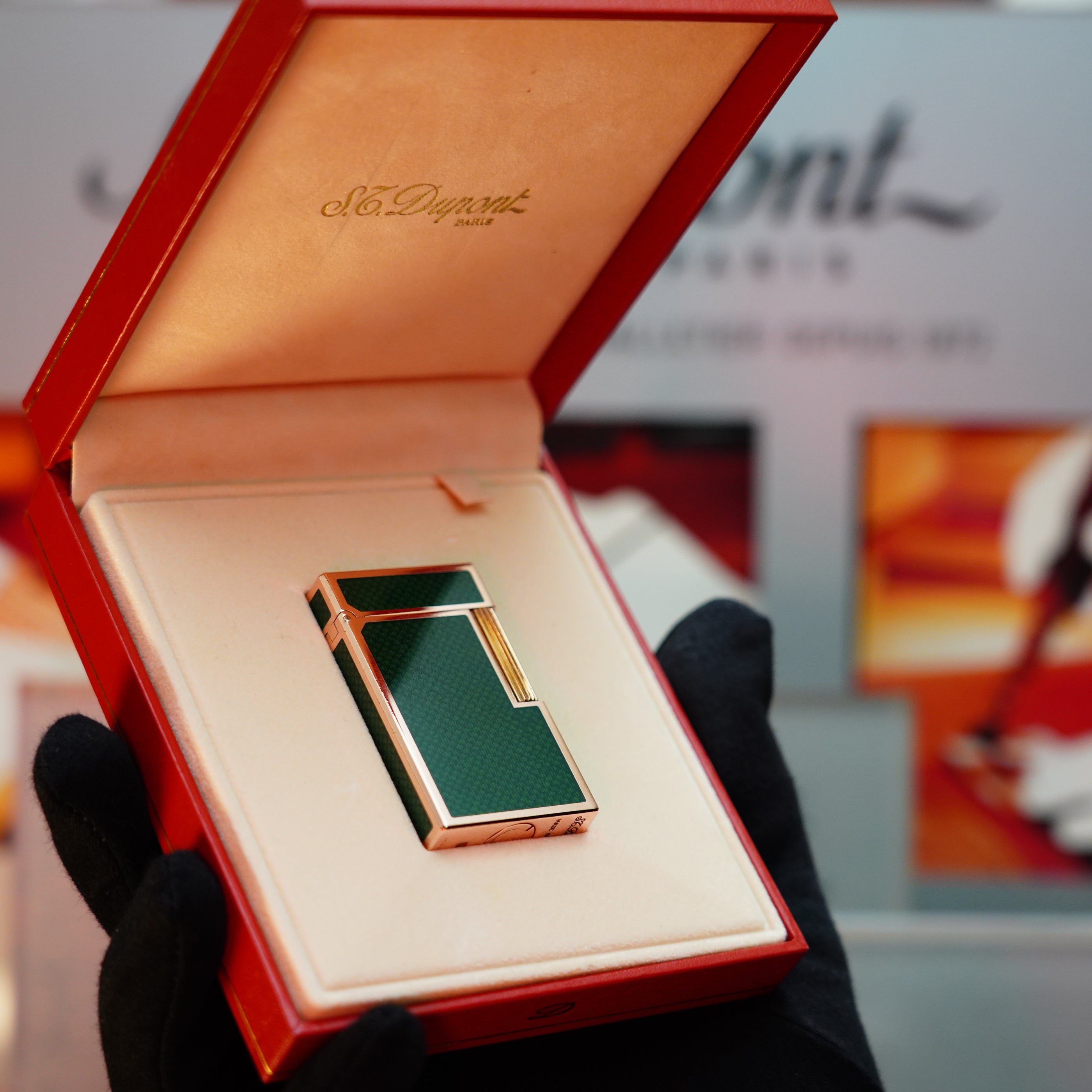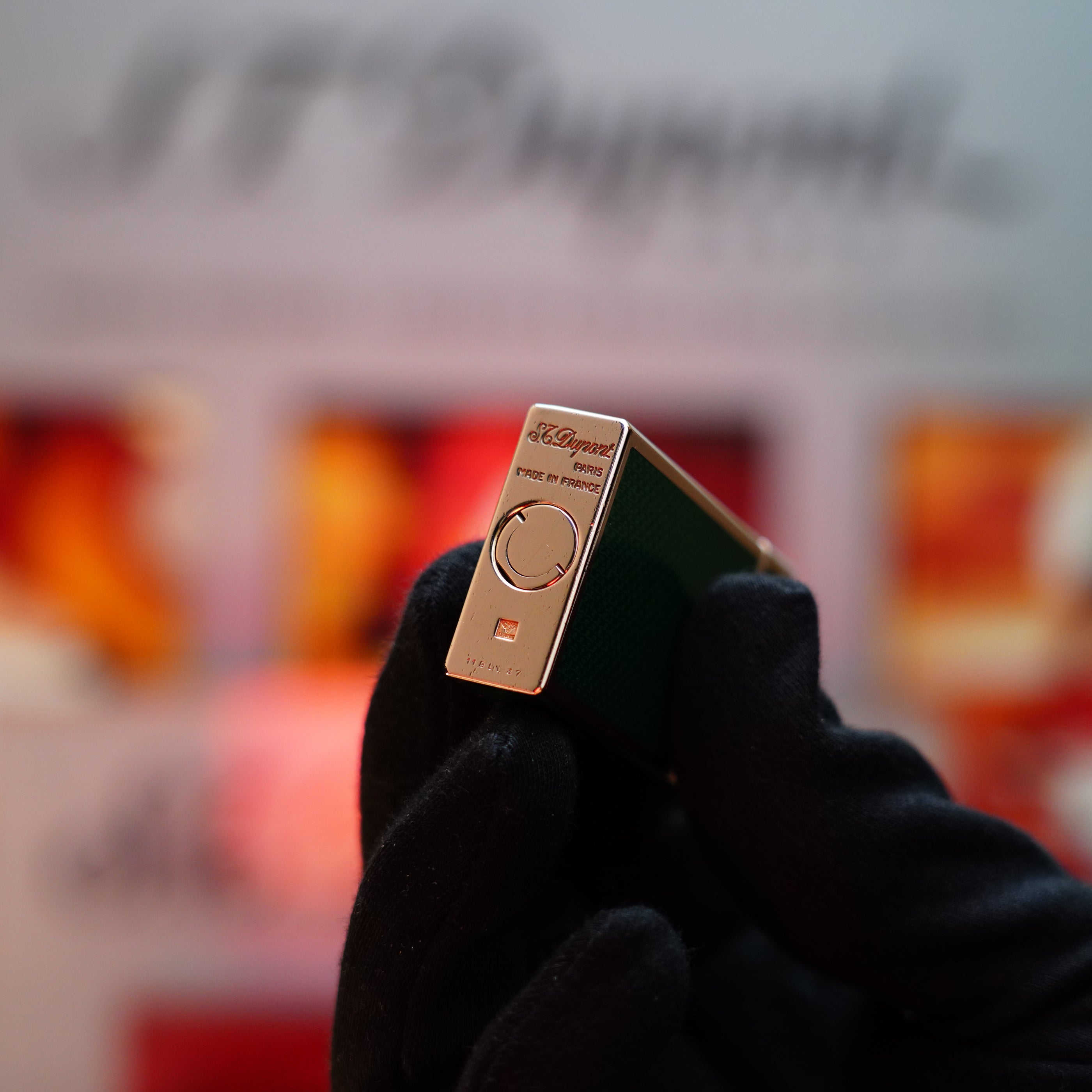 This beautiful Vintage St Dupont Rare Contemporaine Ligne 1 Green Vert Filet Plaq Lacquer 24k Gold Finish Used Lighter was crafted in the 1990. It is a beautiful example of Heavy 24k Gold Plated Limited Large ligne 1 Series