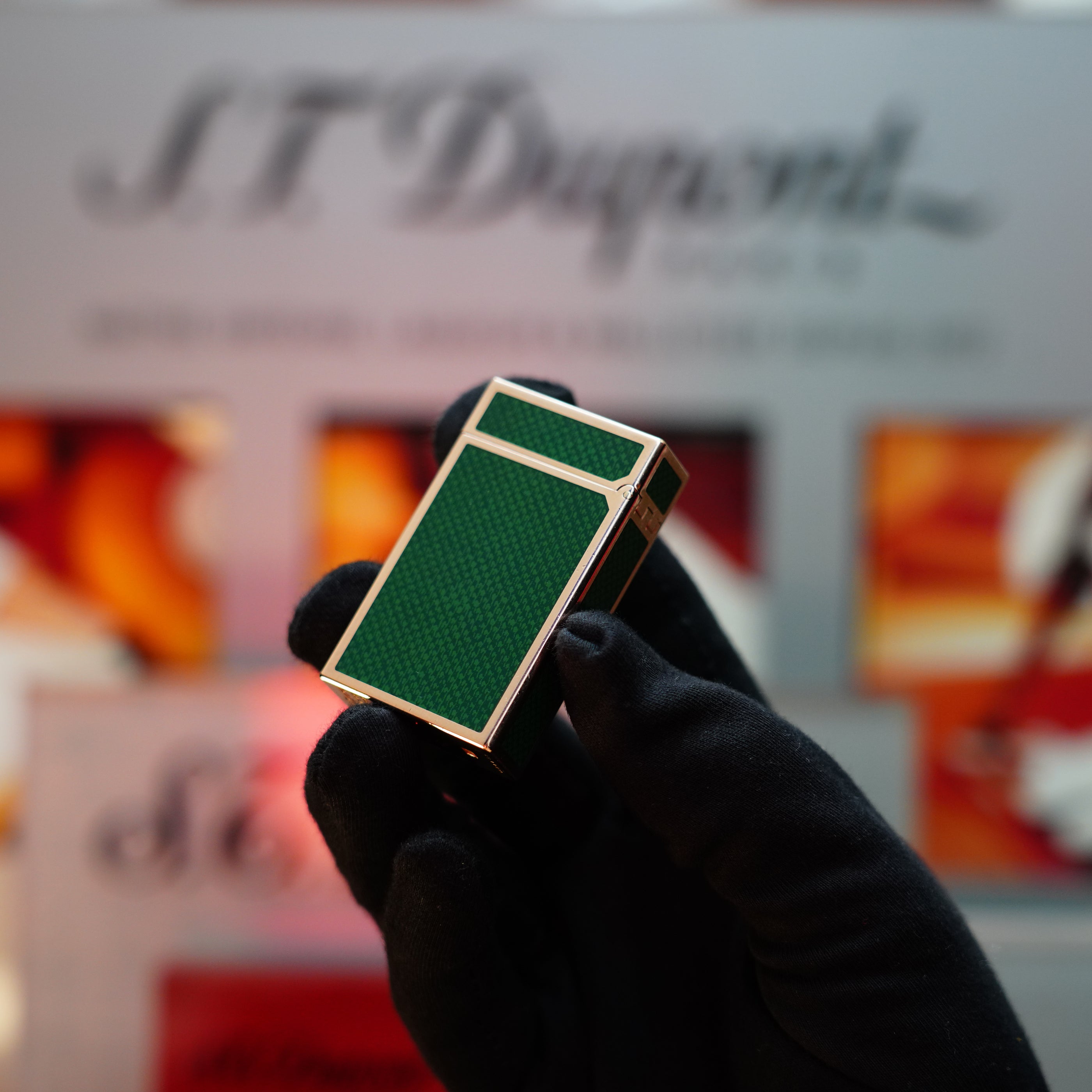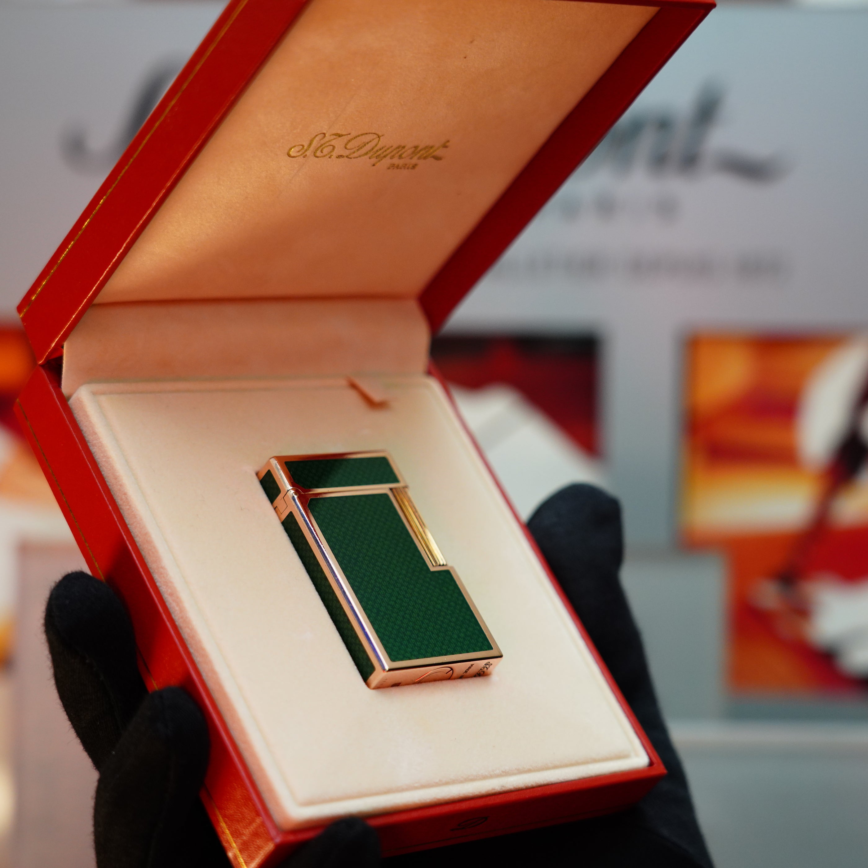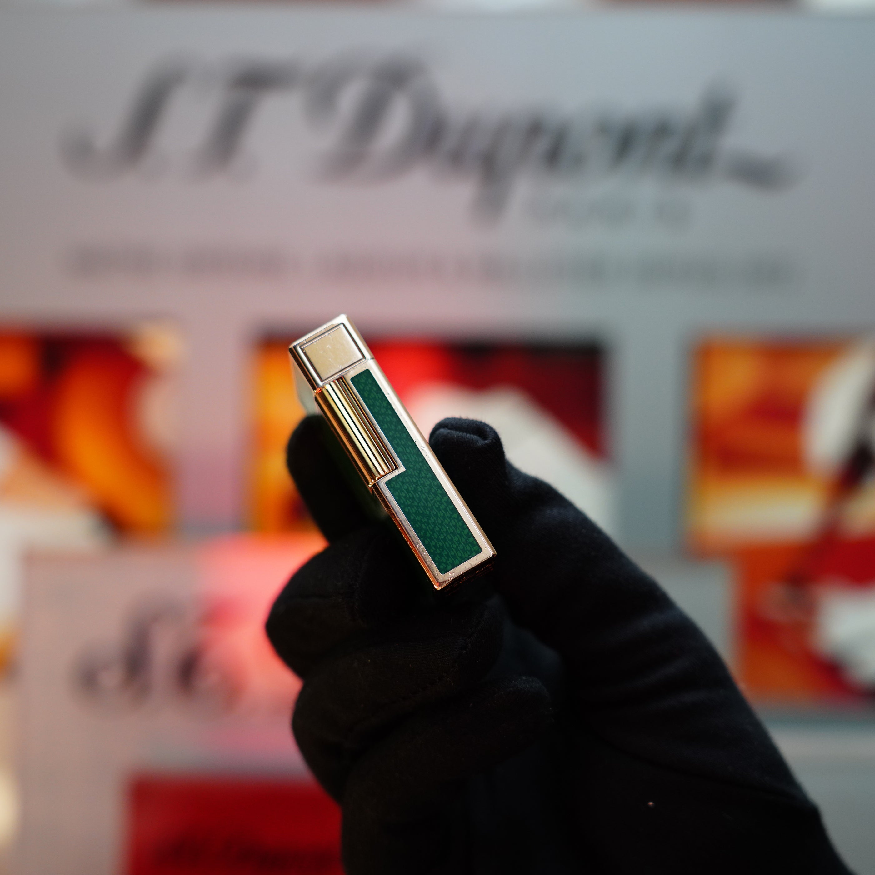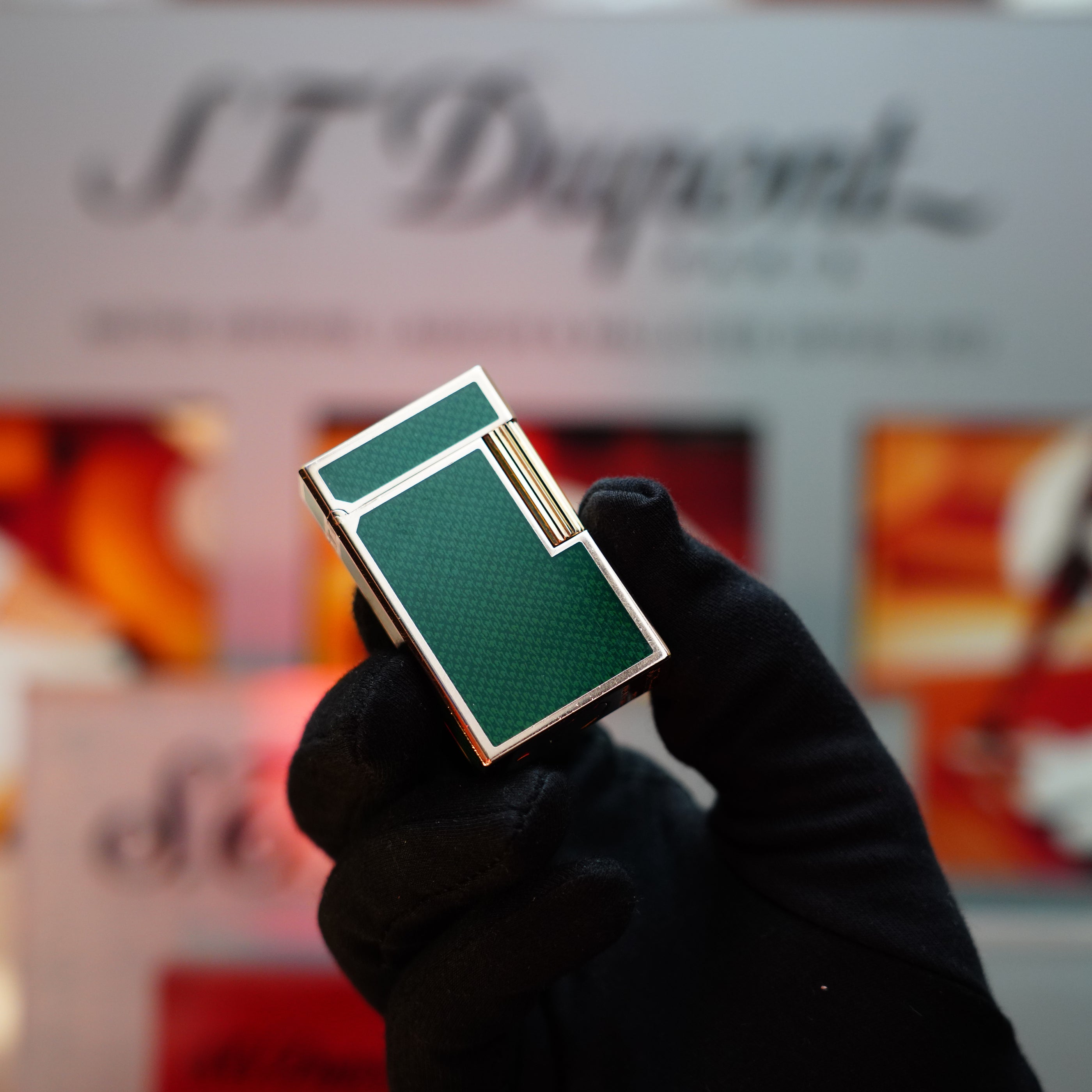 This beautiful Vintage St Dupont Rare Contemporaine Ligne 1 Green Vert Filet Plaq Lacquer 24k Gold Finish Used Lighter was crafted in the 1990. It is a beautiful example of Heavy 24k Gold Plated Limited Large ligne 1 Series
