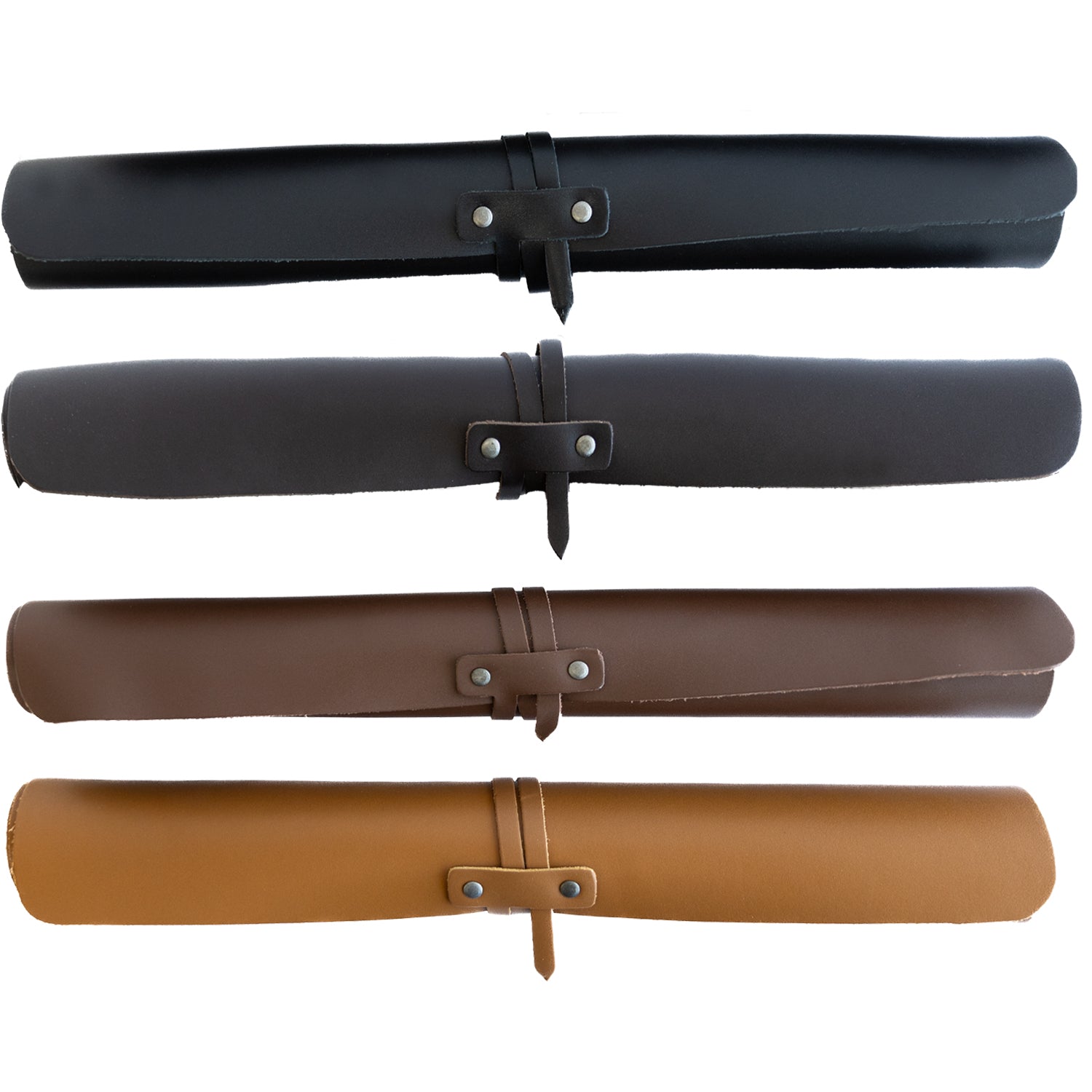 Each shoe shine carpet rolls up easily and secures with a leather strap, making it both functional and portable. Made in India from full-grain leather with raw, unfinished leather edges.